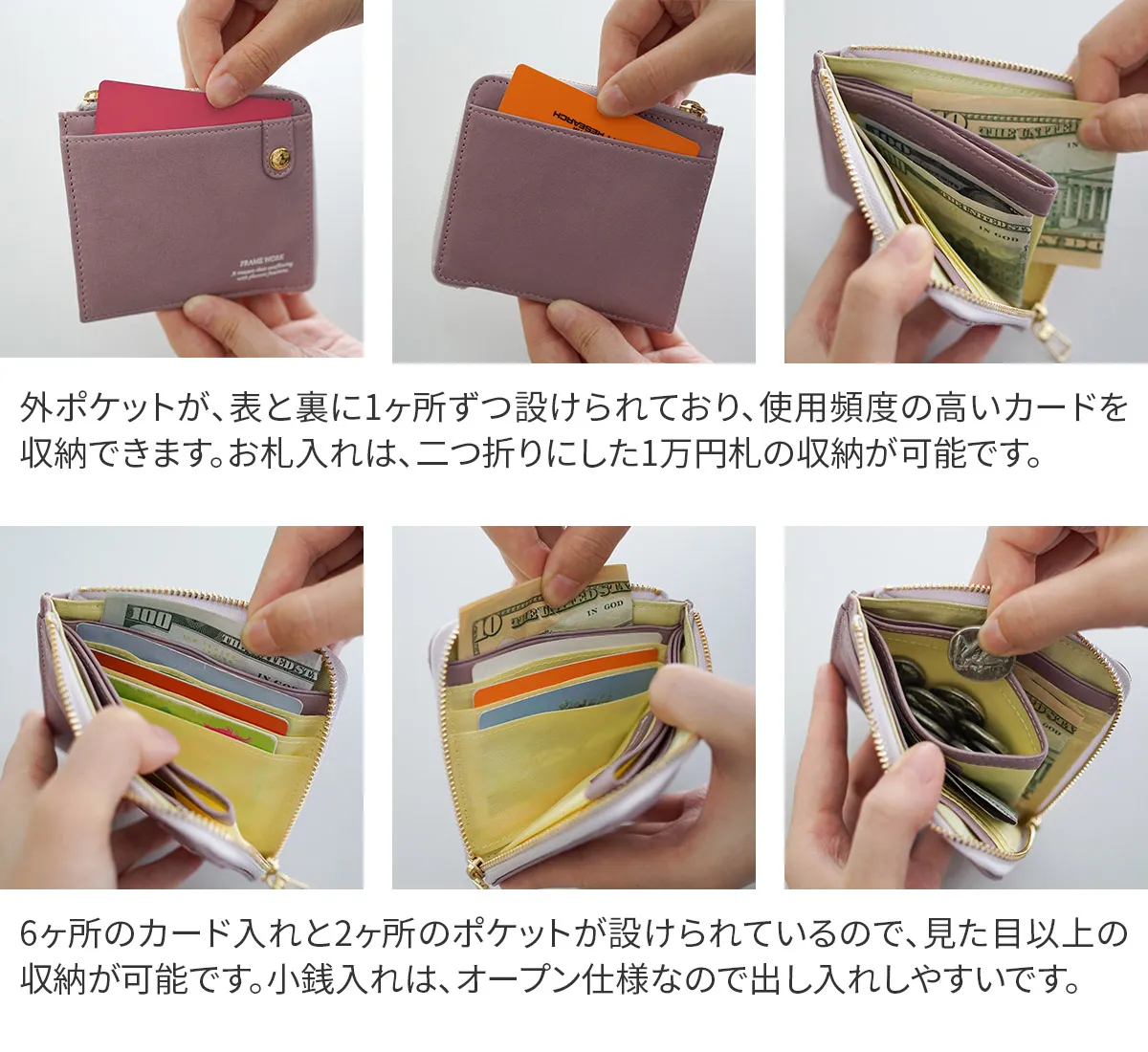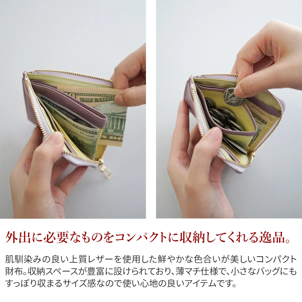 美しくスマートに持てる、極薄設計のエレガントウォレット。 柔らかなレザーに施されたオリジナルブローチと豊富なカラーバリエーションで洗練された大人の手元を演出します。 手に馴染む滑らかなレザーを使用した上品な印象が感じられる財布。 薄マチなので、小さなバッグにすっぽり収まるサイズ感です。 柔らかなカラー展開となっており、手元を華やかにしてくれる使い心地の良い逸品です。