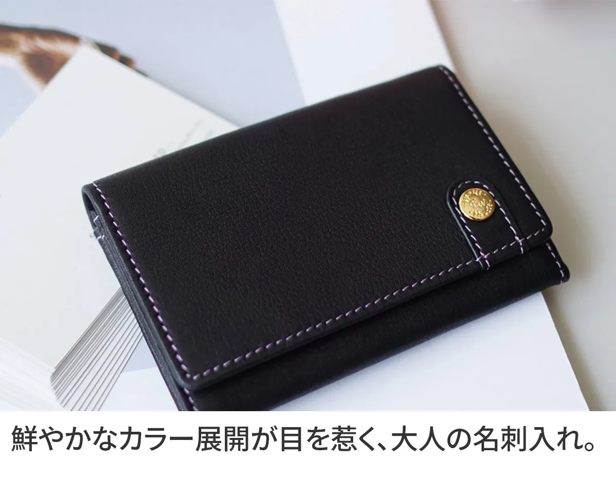美しくスマートに持てる、極薄設計のエレガントウォレット。 柔らかなレザーに施されたオリジナルブローチと豊富なカラーバリエーションで洗練された大人の手元を演出します。 手に馴染む滑らかなレザーを使用した上品な印象が感じられる名刺入れ。 フラップ仕様で取り出しやすいので、ビジネスシーンで大活躍のアイテムです。 柔らかなカラー展開となっており、手元を華やかにしてくれる使い心地の良い逸品です。