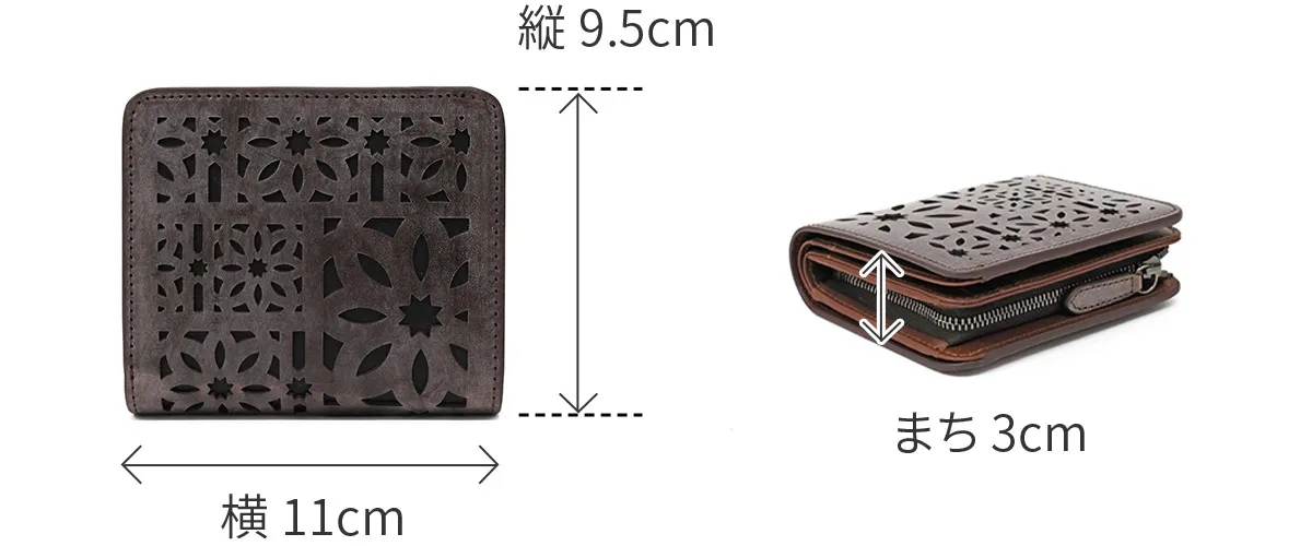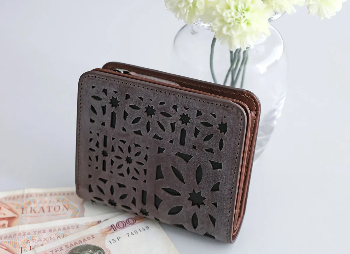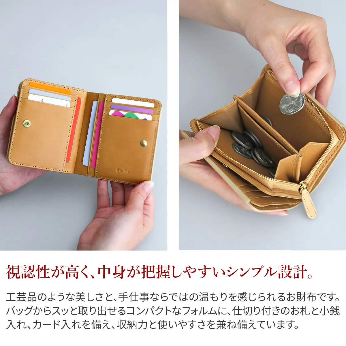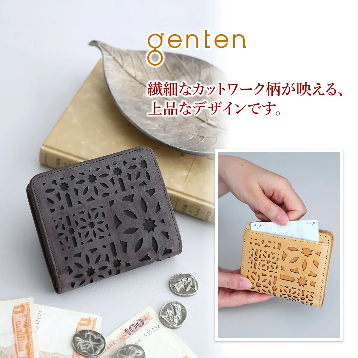 gentenのアイコンのカットワークをレーザーカットで精巧に抜いた、マルチカットワークシリーズ。イタリアのホワイトワックス仕上げの革にアイコンのカットワークを施すことで、洗練された上品なイメージに仕上がっています。 〈素材の特性・メリット〉 鞣し加工:イタリア鞣しの種類:タンニン鞣し、ホワイトワックス仕上げ イタリアのテンペスティ社の植物タンニン鞣し(バケッタ製法)の牛革を使用。銀面をバフがけしたスムースな表面に、ホワイトワックスを数回塗布して仕上げたショルダー革です。内装革:インドのピット鞣しのカーフを使用、軽量できめ細やかな質感をお楽しみください。 同系色のレザーを丁寧に重ね合わせることで、控えめながらも美しいコントラストを演出。コンパクトながら収納力に優れた二つ折りタイプ。手にしっくりと馴染むサイズ感で、日常使いにぴったりのアイテムです。スナップボタンでスムーズな開閉ができ、開くと計9ヶ所のカードポケットを一望できます。お札入れと小銭入れは仕切り付きで、中身の仕分けも行え、快適な使い心地です。