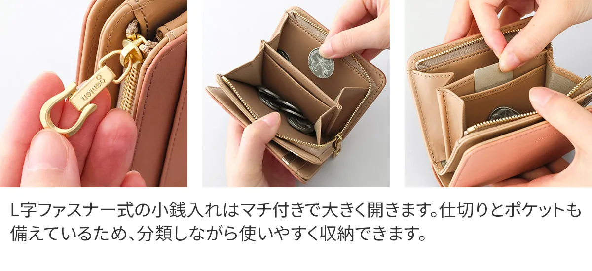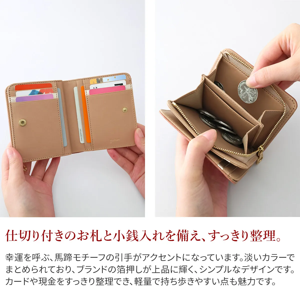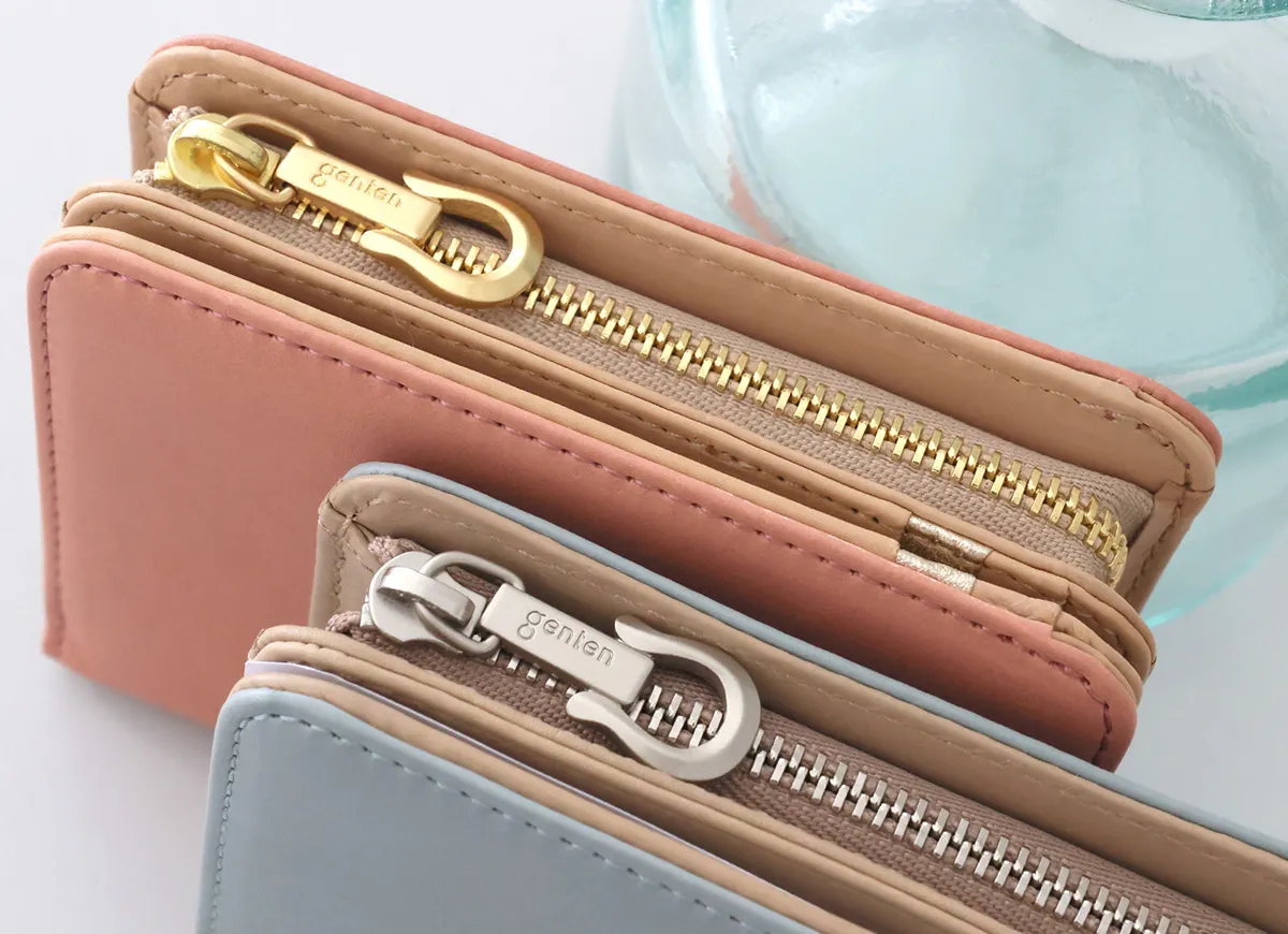アルモニア=イタリア語で“調和” 2026年春を彩る福財布のアイテム。2026年は午(うま)年ということで、長年内装に入れてきたラッキーチャームの素押しではなく、gentenのロゴ入りのオリジナルのホースシューの引き手をお付けしています。ホースシューは馬蹄のUの字の形が幸運を受け止めてくれるシンボルと世代問わずに親しまれています。財布を開くと内装には光を受けて煌めく箔押しのカード段が一段でアクセントに。 〈素材の特性・メリット〉 鞣しの種類:白鞣し 白鞣しの下地から染色をしているため、経年しても赤味が出にくく色が冷めていくのが特徴。非常に軽量で、きめ細やかな手触りをお楽しみください。 滑らかな牛革にニュアンスカラーとブランドロゴの箔押しが映えるシンプルなデザインです。仕切り付きの小銭入れとお札入れを備えた、使い勝手の良い二つ折り財布です。必要なものをすっきりと整理でき、日常使いにちょうど良いコンパクトさが魅力。シンプルながら機能性に優れ、幅広いシーンで活躍します。