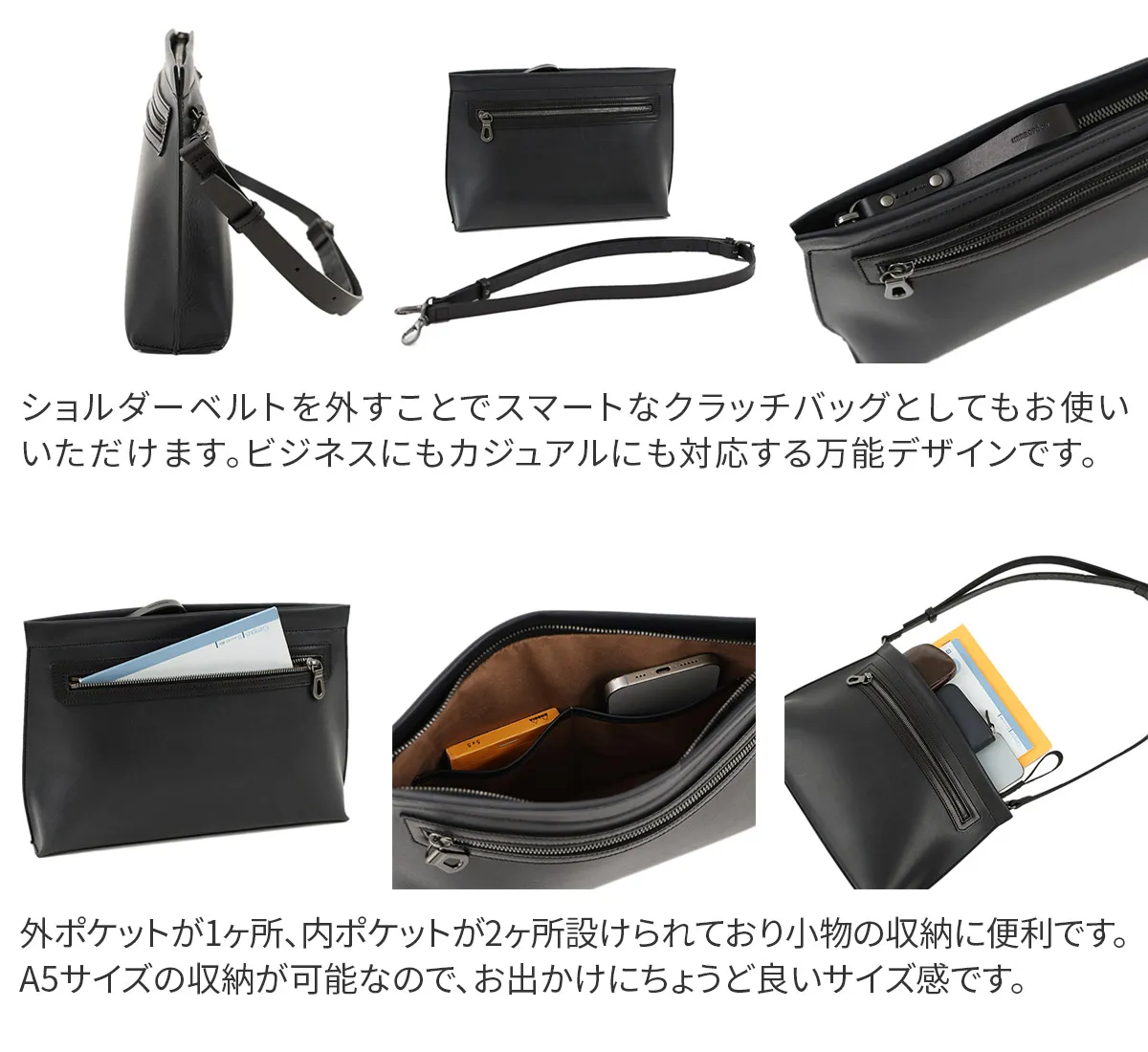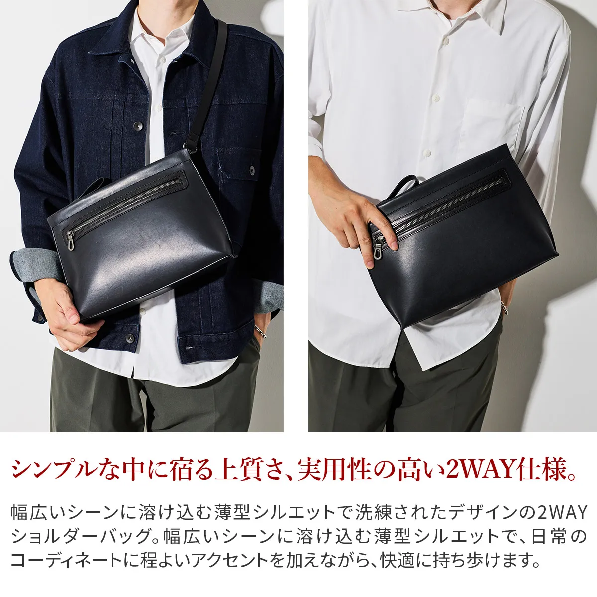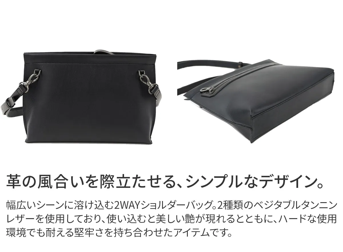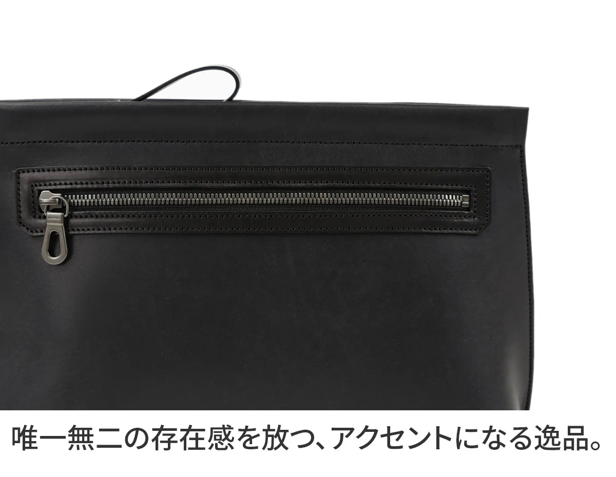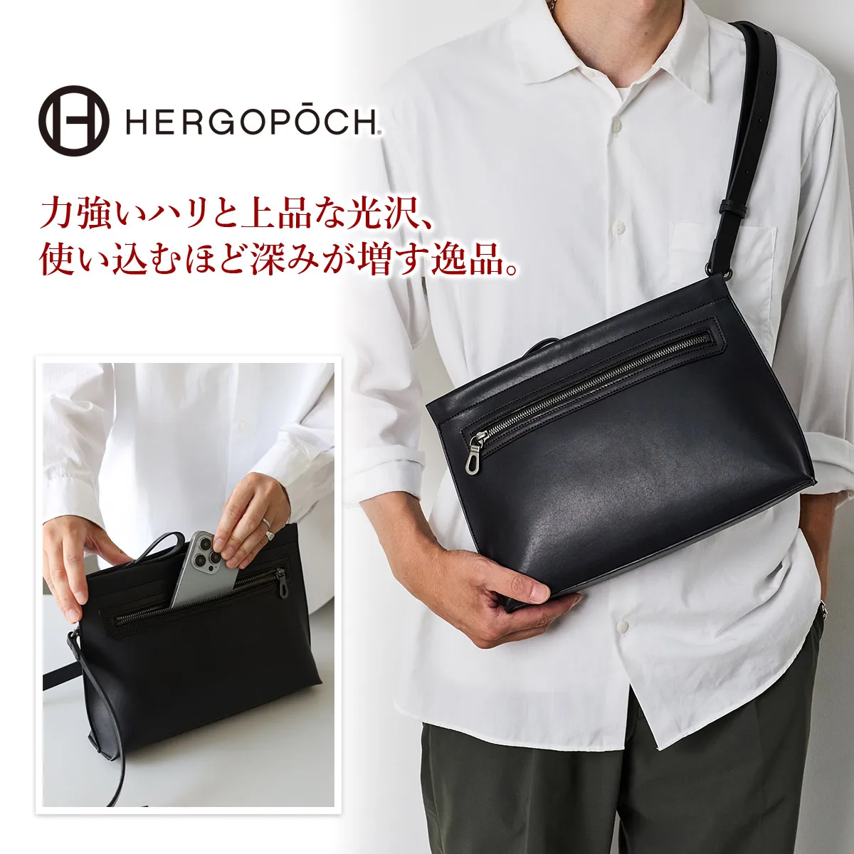 HERGOPOCH × Sentire-One 別注モデル。 唯一無二の存在感を放つ、2WAYショルダーバッグ。 ≪素材の説明≫ 「2種類のベジタブルタンニンレザーを使用」 本体の革には、ソフトヌメ革を使用。 ベジタブルタンニン鞣しの下地にじっくりとオイルを揉み込み、さらに染料染め段階でパラフィン(石蝋)を加えています。 それにより使うほどに馴染み、美しい艶と味わい深い経年変化が楽しめるレザーに仕上がっています。 ベルト、ハンドル、ショルダーストラップなどの耐久性を求められるパーツにはヌメ革(ピット槽鞣し)を使用。 植物樹脂タンニンが入った槽に長期間つけ込むピット鞣しによるこの本ヌメ革は、革本来の風合いが感じられる染料仕上げです。 使い込むと美しい艶が現れるとともに、ハードな使用環境でも耐える堅牢さを持ちます。 ≪こだわりの素材≫ 厳選されたオリジナルレザー「ベジタブルタンニンレザー」を贅沢に使用。 植物由来のタンニンでじっくりと鞣された革は、力強いハリと上品な光沢が魅力。 使い込むほどに深みが増し、やわらかく艶やかな表情へと変化します。 ≪洗練されたデザイン≫ 幅広いシーンに溶け込む薄型シルエット。 無駄を削ぎ落としたシンプルなデザインが、革の風合いを際立たせます。 付属の肉厚レザーが程よいアクセントを添え、上質感と個性を両立。 ≪実用性の高い2WAY仕様≫ 軽やかなショルダーバッグとして両手を自由に。 日常のコーディネートに程よいアクセントを加えながら、快適に持ち歩けます。 ストラップを外せば、スマートなクラッチバッグに早変わり。 ビジネスにもカジュアルにも対応する万能デザインです。 ≪ここでしか手に入らない特別モデル≫ HERGOPOCHとSentire-Oneの共同開発による完全オリジナル。 数量限定、当店だけの販売です。 シンプルな中に宿る上質さを、ぜひ手に取ってご体感ください。