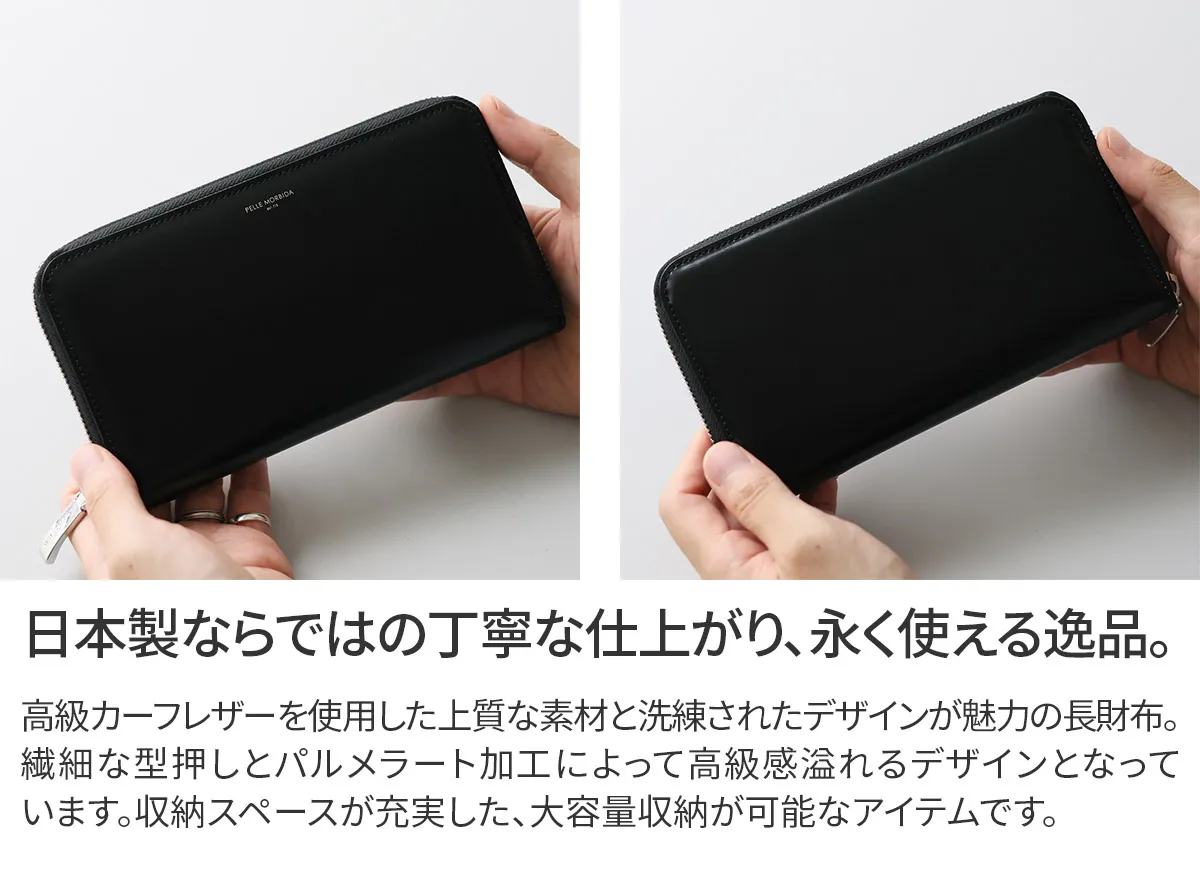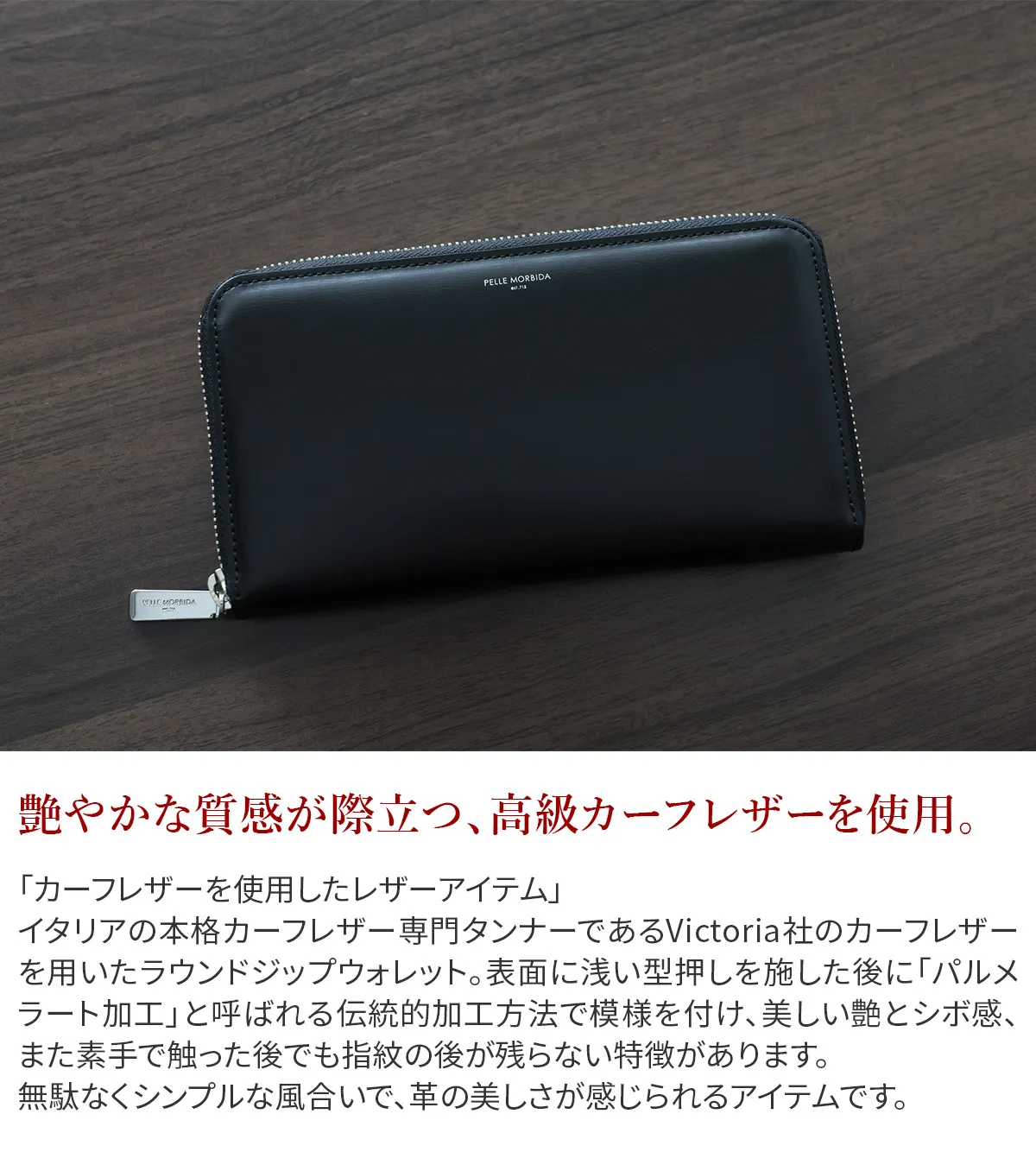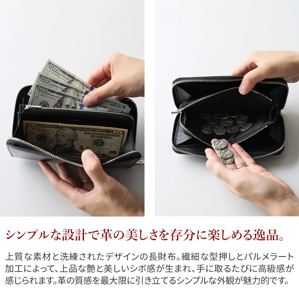 「カーフレザーを使用したレザーアイテム」 イタリアの本格カーフレザー専門タンナーであるVictoria社のカーフレザーを用いたラウンドジップウォレット。表面に浅い型押しを施した後に「パルメラート加工」と呼ばれる伝統的加工方法で模様を付け、美しい艶とシボ感、また素手で触った後でも指紋の後が残らない特徴があります。 無駄なくシンプルな風合いで、革の美しさが感じられるアイテムです。 イタリアの老舗タンナー〈Victoria社〉のカーフレザーを使用した、ラウンドジップウォレットです。 艶やかな質感が際立ち、手にした瞬間から高級感を感じられる仕上がりになっています。 ミディアムサイズながら、カードは13枚収納可能。 札入れ2か所とコインケースも備えており、機能面も充実しています。 実用性とエレガントさを兼ね備えたデザインで、日常に品格を添えてくれる財布です。