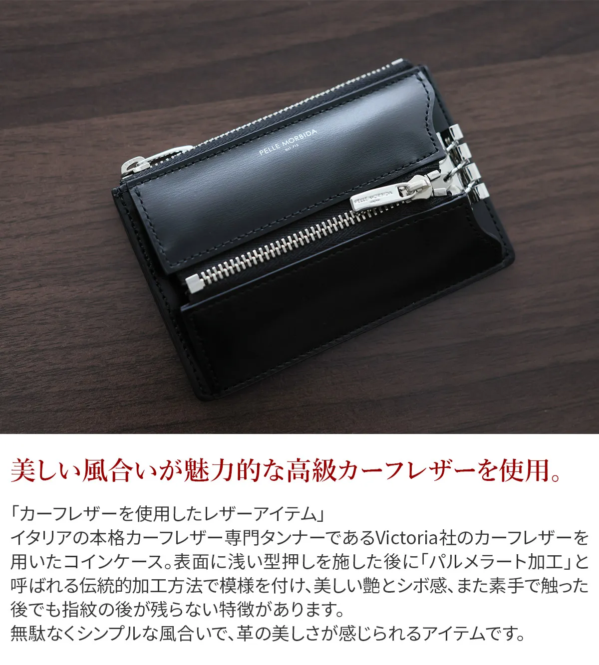 「カーフレザーを使用したレザーアイテム」 イタリアの本格カーフレザー専門タンナーであるVictoria社のカーフレザーを用いたコインケース。 表面に浅い型押しを施した後に「パルメラート加工」と呼ばれる伝統的加工方法で模様を付け、美しい艶とシボ感、 また素手で触った後でも指紋の後が残らない特徴があります。 無駄なくシンプルな風合いで、革の美しさが感じられるアイテムです。 正面のファスナーデザインがアクセントとなっており、シンプルながらも個性を感じさせる仕上がり。 小銭やカードの収納はもちろん、鍵も取り付けられる機能を備えており、日常使いに便利なアイテムです。