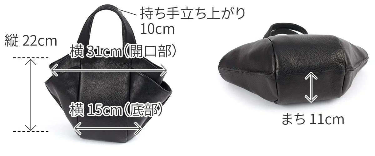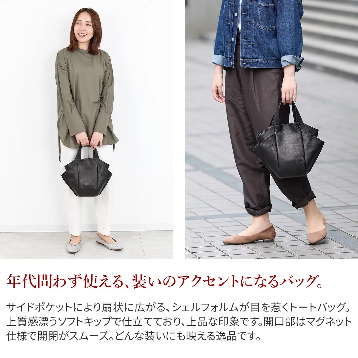 キメ細やかでしっとりと手に吸い付くようなソフトキップを贅沢に使った、20年以上続くVIADOAN定番のシリーズです。 サイドポケットにより扇状に広がる、シェルフォルムが目を惹くトートバッグ。 シボの美しい、上質感漂うソフトキップで仕立てており上品な印象です。 開口部は、マグネットで簡単に開閉を行えます。マチ幅をしっかり確保している為、 中身を一目で見渡せ荷物の出し入れもスムーズに行えます。