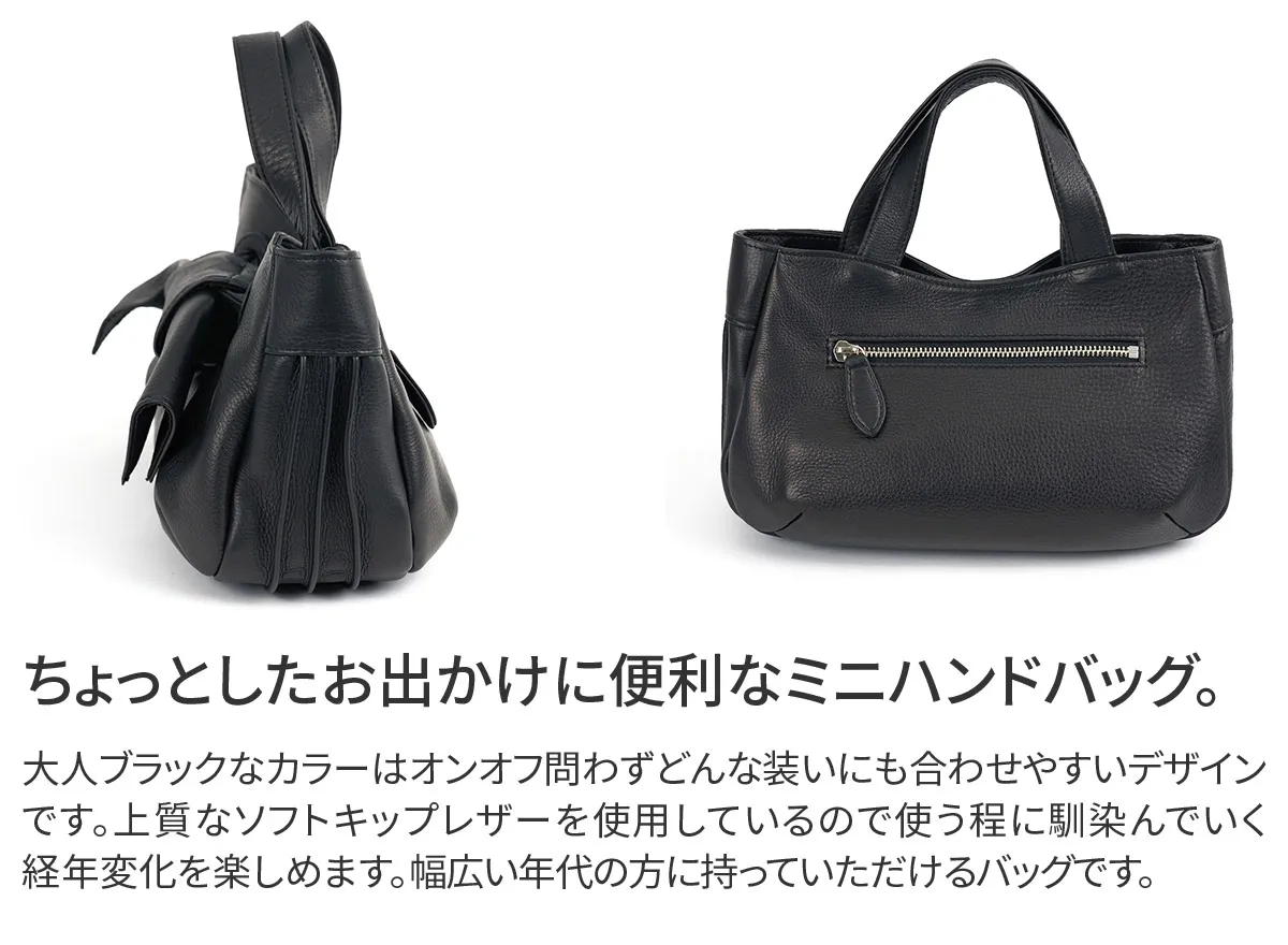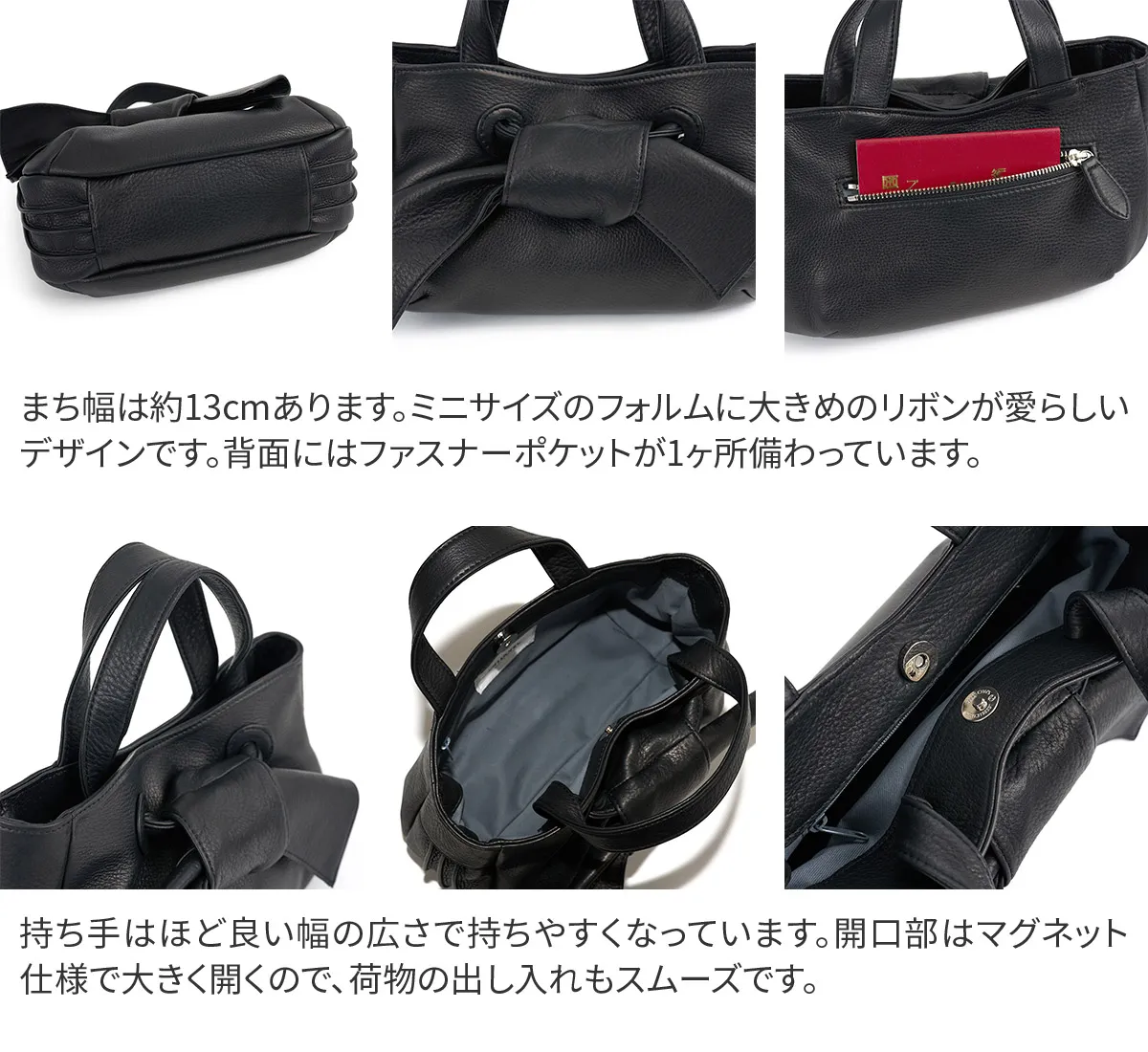 キメ細やかでしっとりと手に吸い付くようなソフトキップを贅沢に使った、20年以上続くVIADOAN定番のシリーズです。 シンプルなボディに大きめのリボンを落とし込んだ、ほどよい存在感を楽しめるミニバッグ。 メイン素材には、肉厚ながら柔らかでしなやかな質感が特徴の仔牛革(ソフトキップ)を使用。 コンパクトなサイズ感でありつつ、小物類の収納に便利なポケットが充実している点が嬉しいポイントです。 オンオフ持てるシックなデザインなので、コーデのアクセントとしても活躍してくれます。