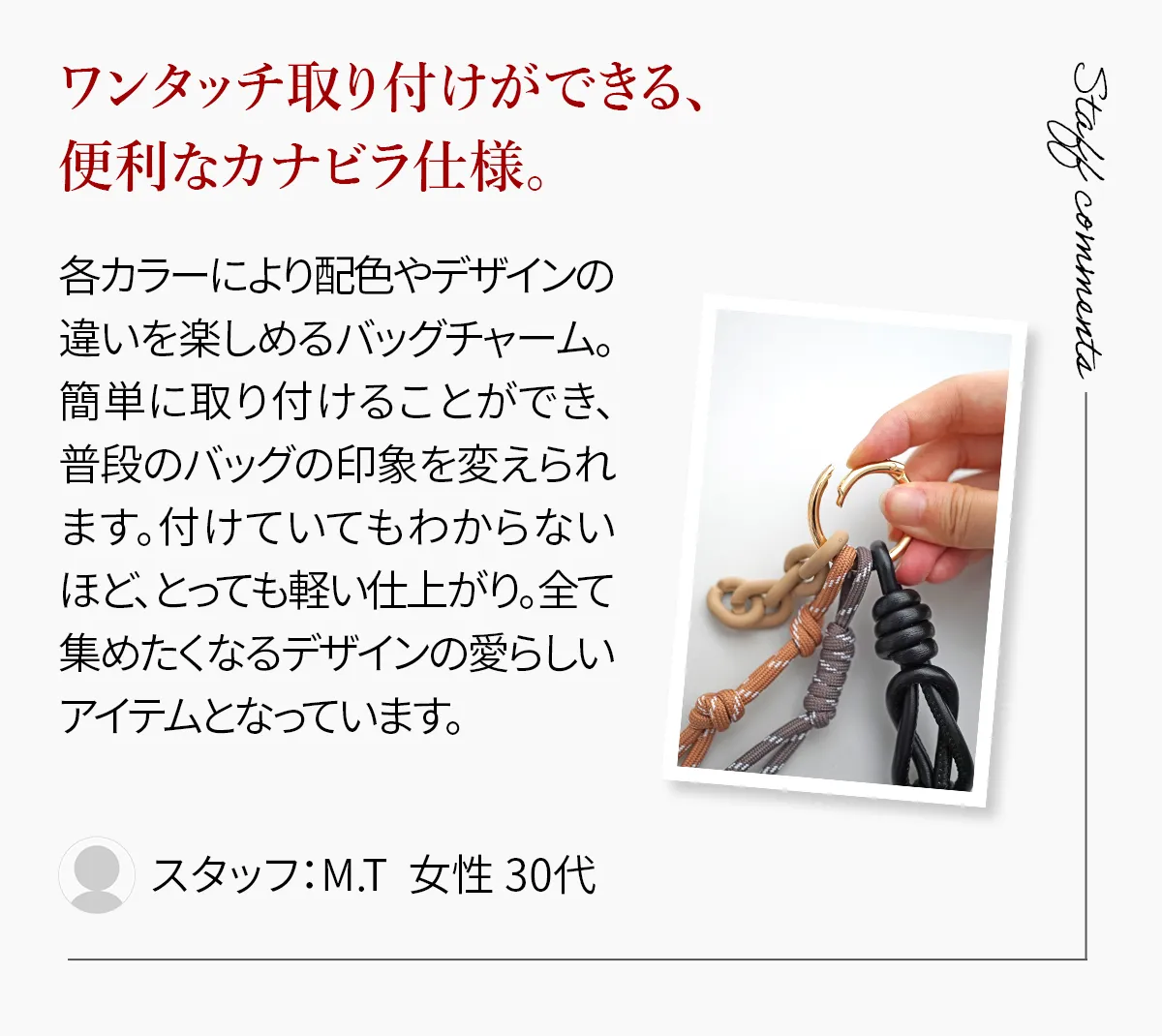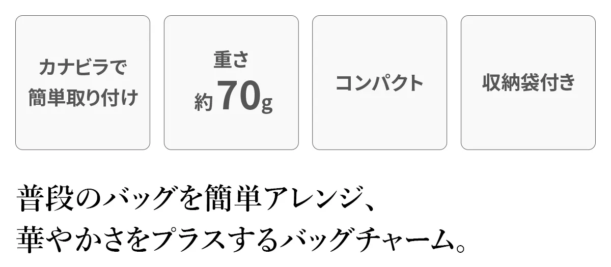 各カラーにより配色やデザインの違いを楽しめるバッグチャーム。 簡単に取り付けることができ、 普段のバッグの印象を変えられます。付けていてもわからないほど、とっても軽い仕上がり。全て集めたくなるデザインの愛らしいアイテムとなっています。