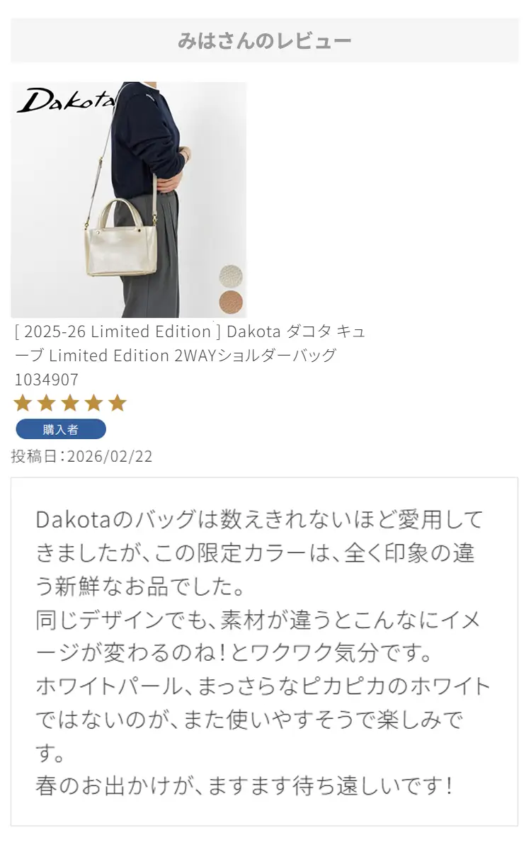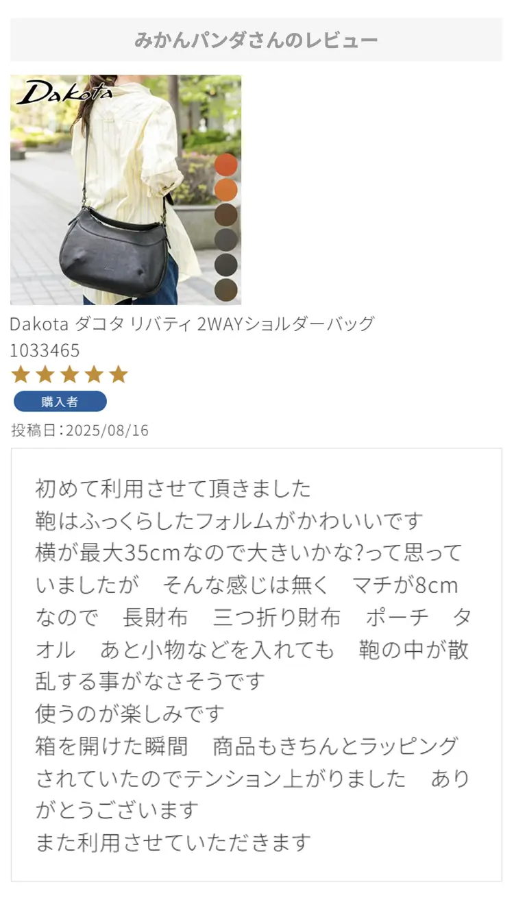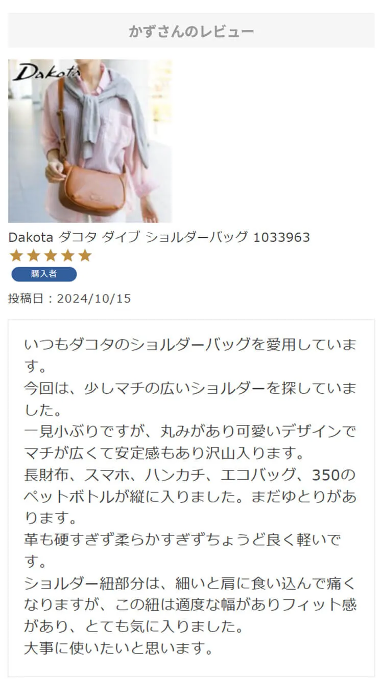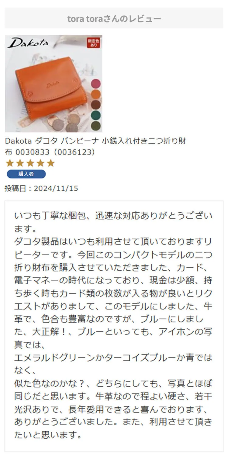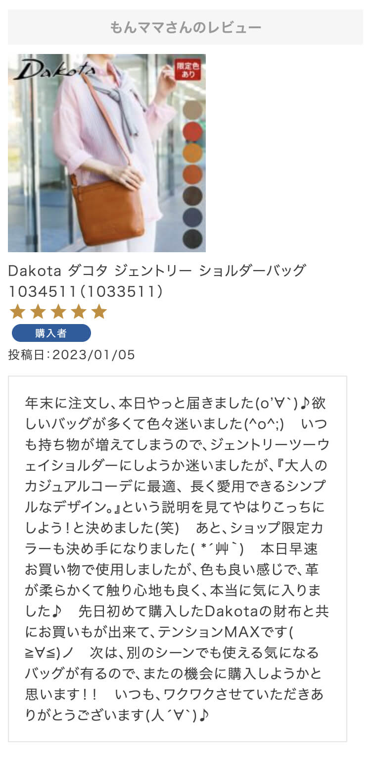 ・【※レビュー大感謝キャンペーンの対象外商品です】 という表記のある商品は、レビューキャンペーンの受付・特典ともに対象外となります。※レビュー自体のご投稿はいただけますが、レビューキャンペーンポイントの付与、および特賞受賞の対象外となります。事前にご確認をお願い致します。 ・当店カートシステムにおきましては、レビューご記入後は一旦必ず「有効待ち」のレビューポイントがお客様に付与され、当店で「有効」処理を実施することで初めてお客様がご利用いただける仕様となっております。レビューキャンペーンの対象商品の場合は「有効」処理を、対象外商品の場合は「無効」処理をそれぞれ行わせていただきます。 ・レビューキャンペーンポイント、誕生日ポイント、アンケート回答ポイント等のポイントを使用して、0円決済や請求金額1,000円以下の少額決済を行われた場合(または繰り返された場合)、過去複数回のご注文におけるご請求金額の合計が一定金額に満たない場合、「(1)該当するご注文のキャンセル」「(2)付与済みのポイントを無効化」 「(3)次回以降のお取引をキャンセル」「(4)今後一切のご注文の受付不可」のいずれか、もしくは全てのご対応をさせていただく場合がございます。その他当店にて悪質であると判断した場合も、同様のご対応をさせていただく場合がございます。 ・レビューご投稿は、事前に会員登録を済ませた上で商品をご購入いただく必要がございます。会員登録がない状態ですとシステム上、ご注文情報とレビューご投稿の紐付けが行えないため、必ず事前に会員ご登録をいただきますよう、お願い致します。 ・商品1点につき1回までのレビューご投稿が可能です。 ・同一商品に複数回レビューご投稿いただいた場合、古いご投稿内容が上書き更新されます(ご投稿日付は古いご投稿日付のままとなります)。誠に恐れ入りますがレビューキャンペーンへのご投稿は、1回目のご投稿・ご投稿月のみの受付とさせていただきます。あらかじめご了承ください。 ・複数商品注文時など、必ずそれぞれの商品の方へ個別にレビュー記入をお願い致します。例えば、DakotaのバッグとDakotaラッピングサービスを同時に注文され、該当バッグのレビューをDakotaラッピングサービスの方へご記入いただいた場合、本キャンペーンの対象外となります。 ・ページ変更や期間限定商品など、一定期間が経過した後、レビューをご記入いただけなくなる商品などもございます。予めご了承ください。 ・他人の権利、利益、名誉などを損ねたり、法令に違反する内容を投稿することはできませんのでご注意ください。レビュー内容が不適切と判断した場合は、レビューの承認不可または、予告なくレビュー投稿を削除させていただく場合がございます。その際、レビューの公開とポイント付与は致しかねますので、何卒ご了承ください。 ・ご投稿いただいたレビューは、当店の商品ページ以外にも、当店の他ぺージ・ブログ等でご紹介させていただく場合がございます。 ・レビューご投稿をいただいた時点で、上記全てをご了承されたものと致します。 |