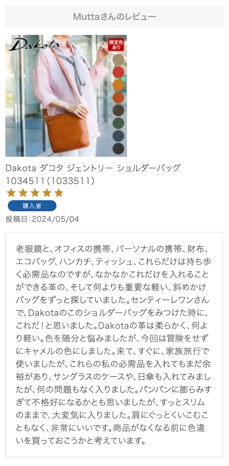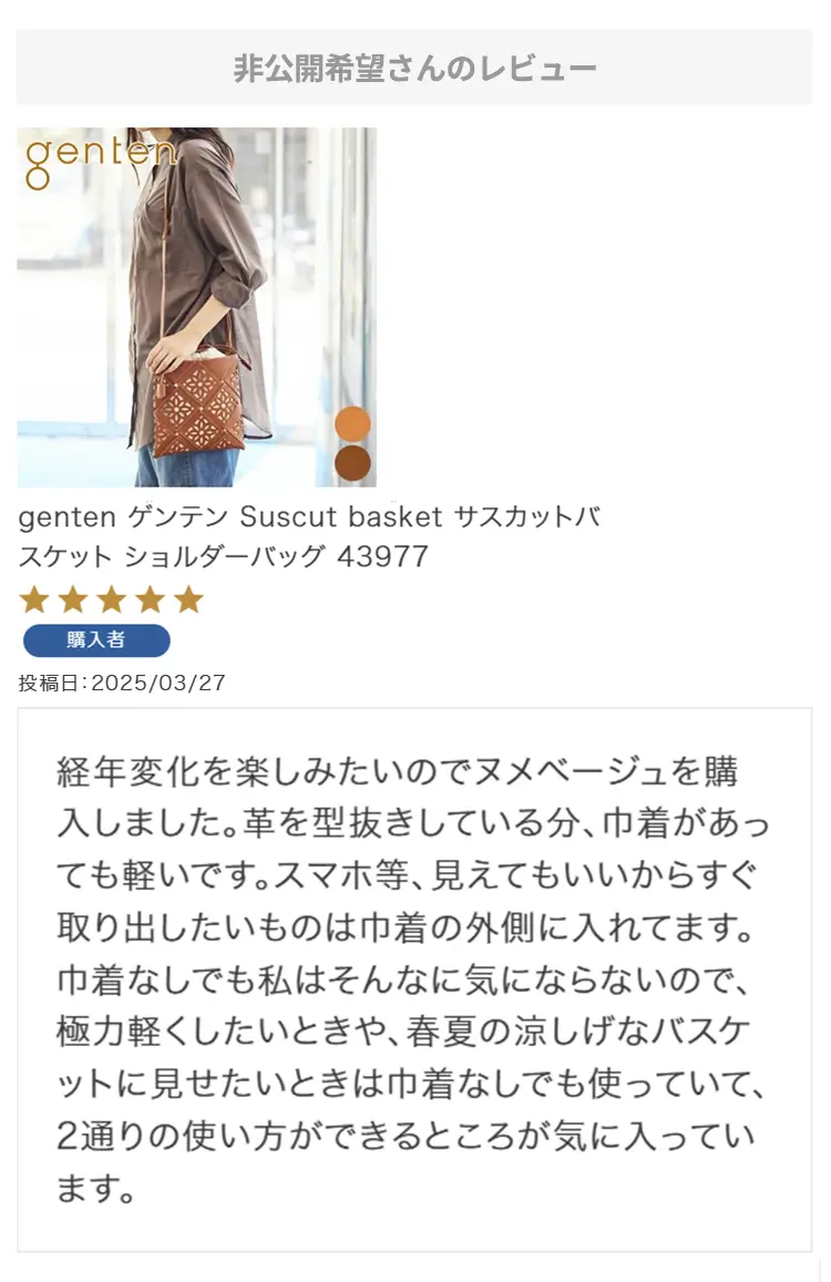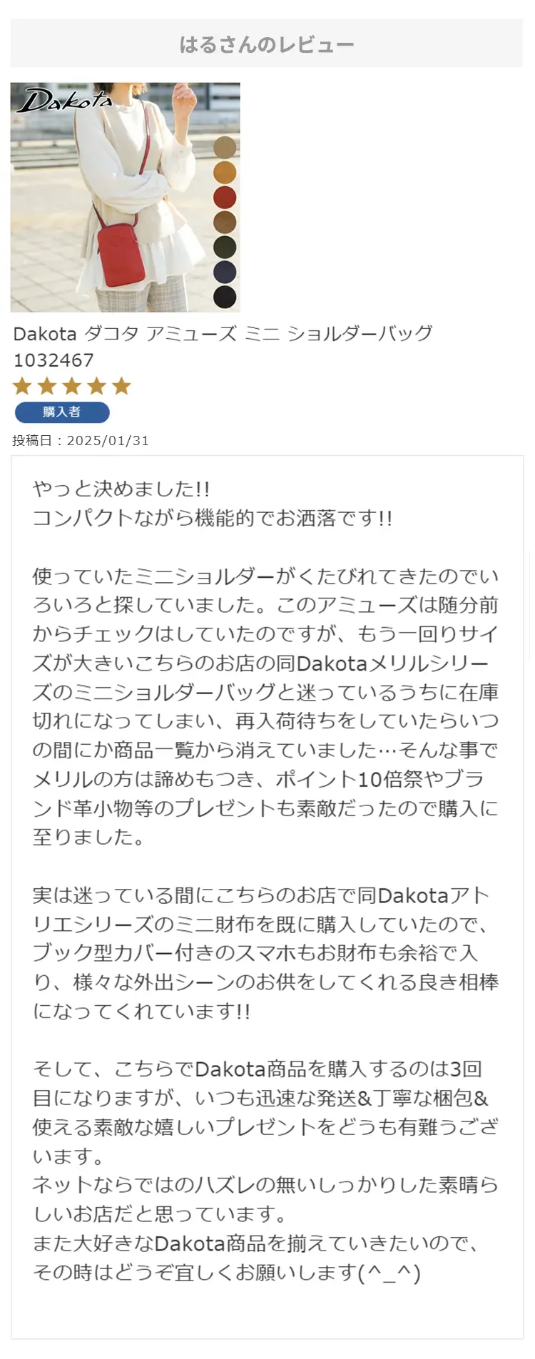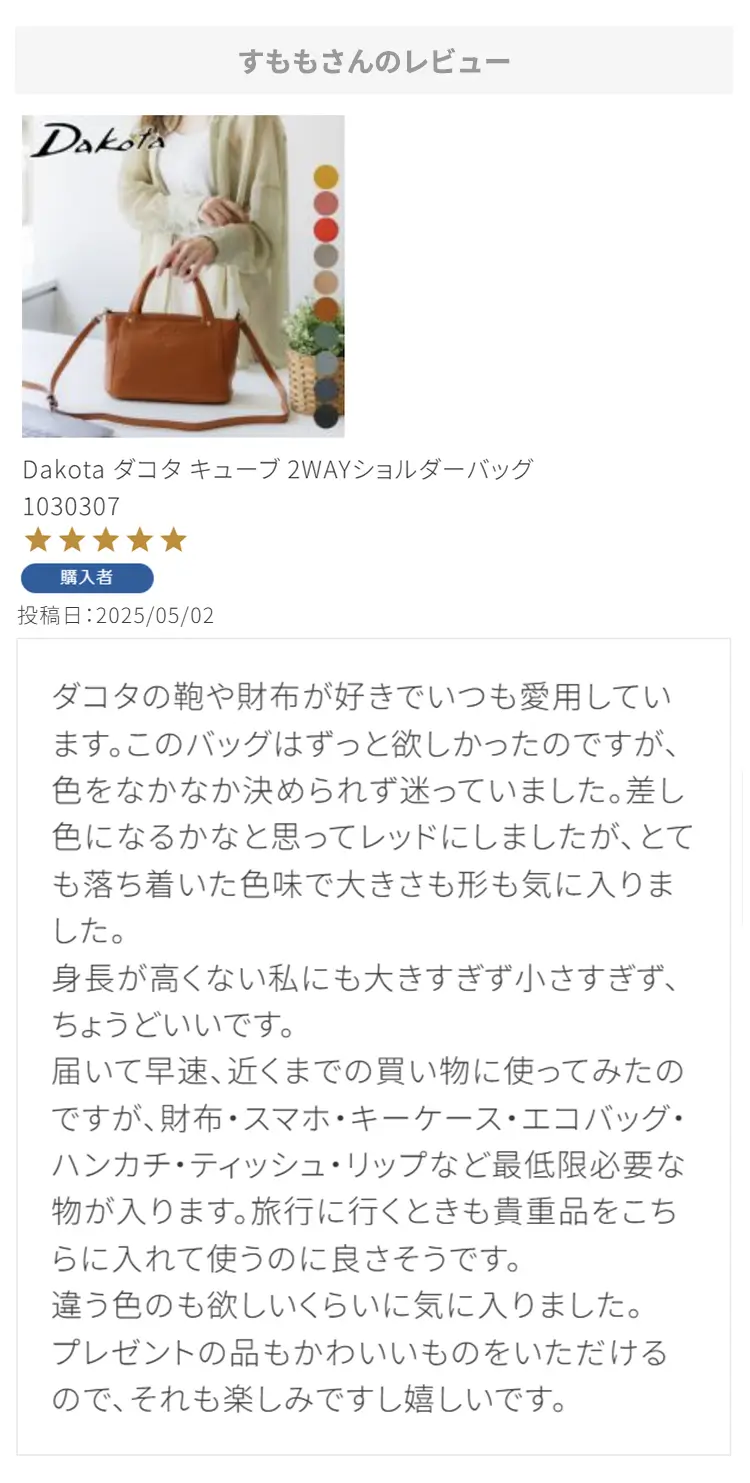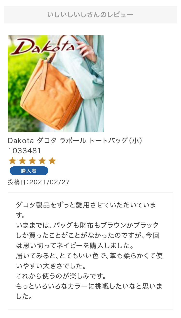 ・【※レビュー大感謝キャンペーンの対象外商品です】 という表記のある商品は、レビューキャンペーンの受付・特典ともに対象外となります。※レビュー自体のご投稿はいただけますが、レビューキャンペーンポイントの付与、および特賞受賞の対象外となります。事前にご確認をお願い致します。 ・当店カートシステムにおきましては、レビューご記入後は一旦必ず「有効待ち」のレビューポイントがお客様に付与され、当店で「有効」処理を実施することで初めてお客様がご利用いただける仕様となっております。レビューキャンペーンの対象商品の場合は「有効」処理を、対象外商品の場合は「無効」処理をそれぞれ行わせていただきます。 ・レビューキャンペーンポイント、誕生日ポイント、アンケート回答ポイント等のポイントを使用して、0円決済や請求金額1,000円以下の少額決済を行われた場合(または繰り返された場合)、過去複数回のご注文におけるご請求金額の合計が一定金額に満たない場合、「(1)該当するご注文のキャンセル」「(2)付与済みのポイントを無効化」 「(3)次回以降のお取引をキャンセル」「(4)今後一切のご注文の受付不可」のいずれか、もしくは全てのご対応をさせていただく場合がございます。その他当店にて悪質であると判断した場合も、同様のご対応をさせていただく場合がございます。 ・レビューご投稿は、事前に会員登録を済ませた上で商品をご購入いただく必要がございます。会員登録がない状態ですとシステム上、ご注文情報とレビューご投稿の紐付けが行えないため、必ず事前に会員ご登録をいただきますよう、お願い致します。 ・商品1点につき1回までのレビューご投稿が可能です。 ・同一商品に複数回レビューご投稿いただいた場合、古いご投稿内容が上書き更新されます(ご投稿日付は古いご投稿日付のままとなります)。誠に恐れ入りますがレビューキャンペーンへのご投稿は、1回目のご投稿・ご投稿月のみの受付とさせていただきます。あらかじめご了承ください。 ・複数商品注文時など、必ずそれぞれの商品の方へ個別にレビュー記入をお願い致します。例えば、DakotaのバッグとDakotaラッピングサービスを同時に注文され、該当バッグのレビューをDakotaラッピングサービスの方へご記入いただいた場合、本キャンペーンの対象外となります。 ・ページ変更や期間限定商品など、一定期間が経過した後、レビューをご記入いただけなくなる商品などもございます。予めご了承ください。 ・他人の権利、利益、名誉などを損ねたり、法令に違反する内容を投稿することはできませんのでご注意ください。レビュー内容が不適切と判断した場合は、レビューの承認不可または、予告なくレビュー投稿を削除させていただく場合がございます。その際、レビューの公開とポイント付与は致しかねますので、何卒ご了承ください。 ・ご投稿いただいたレビューは、当店の商品ページ以外にも、当店の他ぺージ・ブログ等でご紹介させていただく場合がございます。 ・レビューご投稿をいただいた時点で、上記全てをご了承されたものと致します。 |