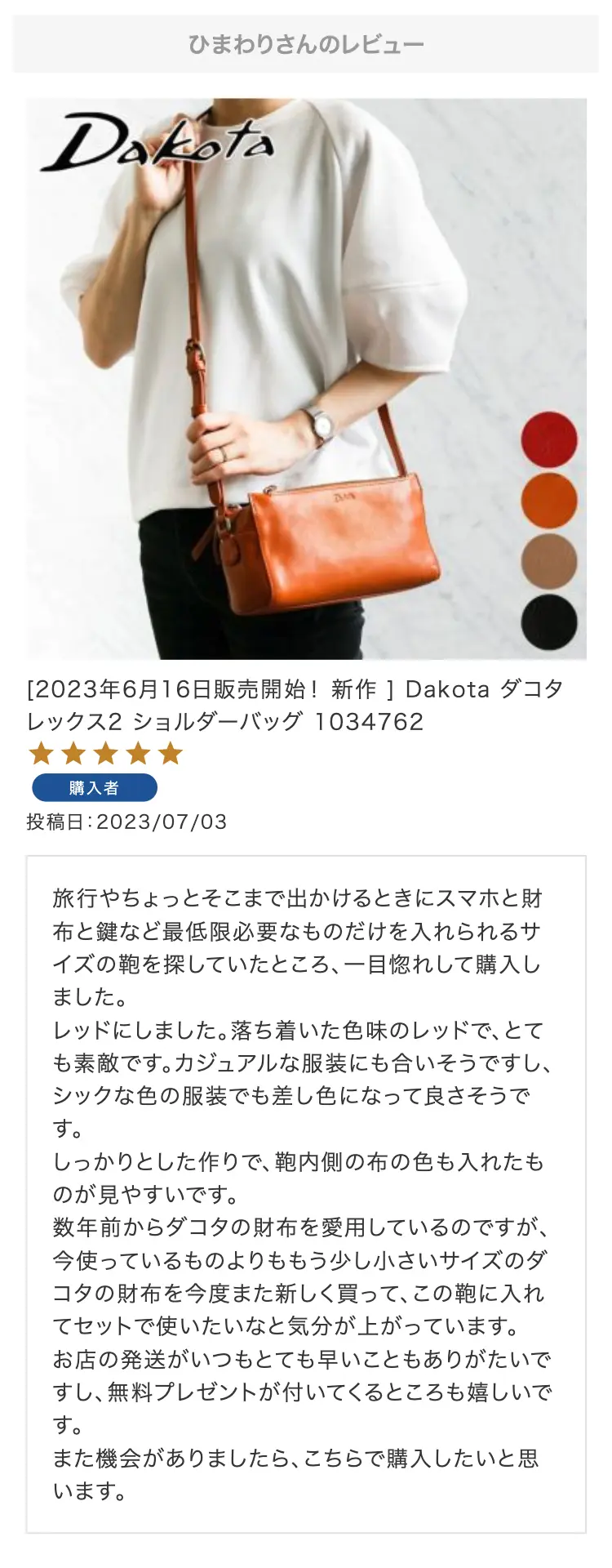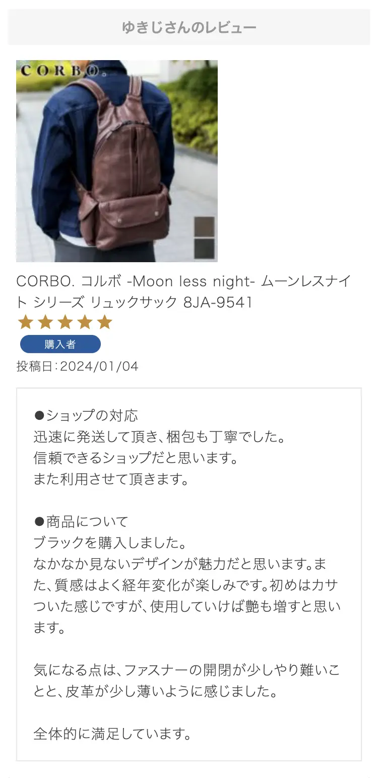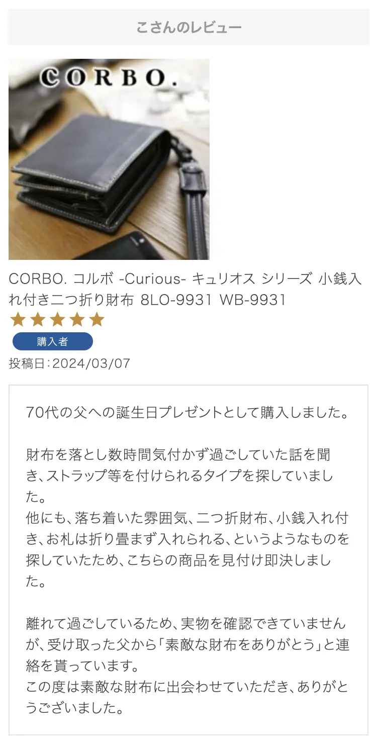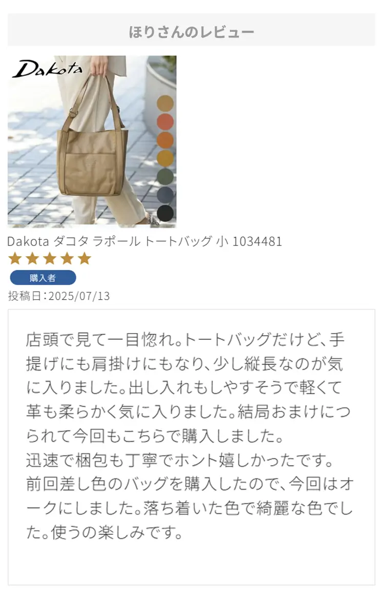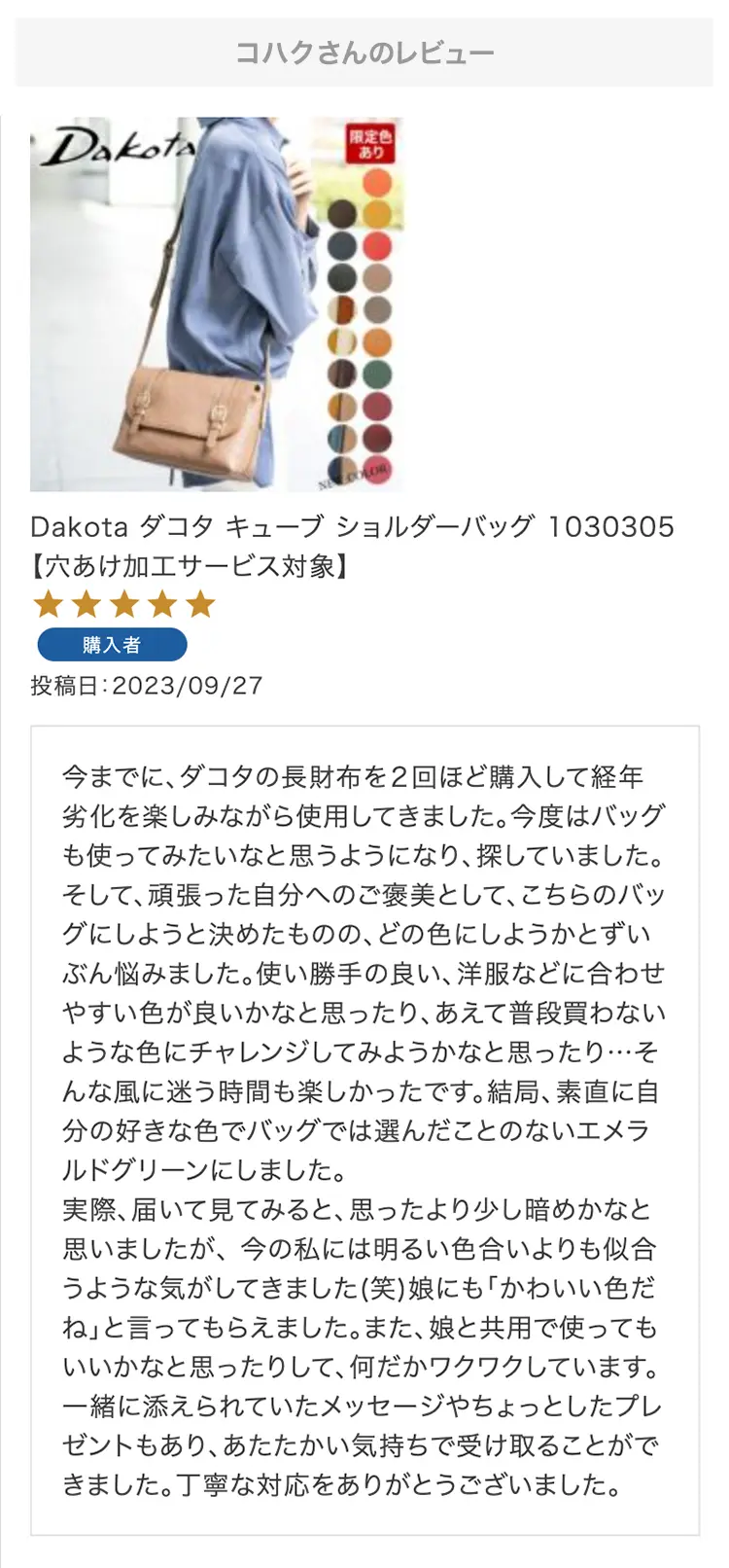 ・【※レビュー大感謝キャンペーンの対象外商品です】 という表記のある商品は、レビューキャンペーンの受付・特典ともに対象外となります。※レビュー自体のご投稿はいただけますが、レビューキャンペーンポイントの付与、および特賞受賞の対象外となります。事前にご確認をお願い致します。 ・当店カートシステムにおきましては、レビューご記入後は一旦必ず「有効待ち」のレビューポイントがお客様に付与され、当店で「有効」処理を実施することで初めてお客様がご利用いただける仕様となっております。レビューキャンペーンの対象商品の場合は「有効」処理を、対象外商品の場合は「無効」処理をそれぞれ行わせていただきます。 ・レビューキャンペーンポイント、誕生日ポイント、アンケート回答ポイント等のポイントを使用して、0円決済や請求金額1,000円以下の少額決済を行われた場合(または繰り返された場合)、過去複数回のご注文におけるご請求金額の合計が一定金額に満たない場合、「(1)該当するご注文のキャンセル」「(2)付与済みのポイントを無効化」 「(3)次回以降のお取引をキャンセル」「(4)今後一切のご注文の受付不可」のいずれか、もしくは全てのご対応をさせていただく場合がございます。その他当店にて悪質であると判断した場合も、同様のご対応をさせていただく場合がございます。 ・レビューご投稿は、事前に会員登録を済ませた上で商品をご購入いただく必要がございます。会員登録がない状態ですとシステム上、ご注文情報とレビューご投稿の紐付けが行えないため、必ず事前に会員ご登録をいただきますよう、お願い致します。 ・商品1点につき1回までのレビューご投稿が可能です。 ・同一商品に複数回レビューご投稿いただいた場合、古いご投稿内容が上書き更新されます(ご投稿日付は古いご投稿日付のままとなります)。誠に恐れ入りますがレビューキャンペーンへのご投稿は、1回目のご投稿・ご投稿月のみの受付とさせていただきます。あらかじめご了承ください。 ・複数商品注文時など、必ずそれぞれの商品の方へ個別にレビュー記入をお願い致します。例えば、DakotaのバッグとDakotaラッピングサービスを同時に注文され、該当バッグのレビューをDakotaラッピングサービスの方へご記入いただいた場合、本キャンペーンの対象外となります。 ・ページ変更や期間限定商品など、一定期間が経過した後、レビューをご記入いただけなくなる商品などもございます。予めご了承ください。 ・他人の権利、利益、名誉などを損ねたり、法令に違反する内容を投稿することはできませんのでご注意ください。レビュー内容が不適切と判断した場合は、レビューの承認不可または、予告なくレビュー投稿を削除させていただく場合がございます。その際、レビューの公開とポイント付与は致しかねますので、何卒ご了承ください。 ・ご投稿いただいたレビューは、当店の商品ページ以外にも、当店の他ぺージ・ブログ等でご紹介させていただく場合がございます。 ・レビューご投稿をいただいた時点で、上記全てをご了承されたものと致します。 |