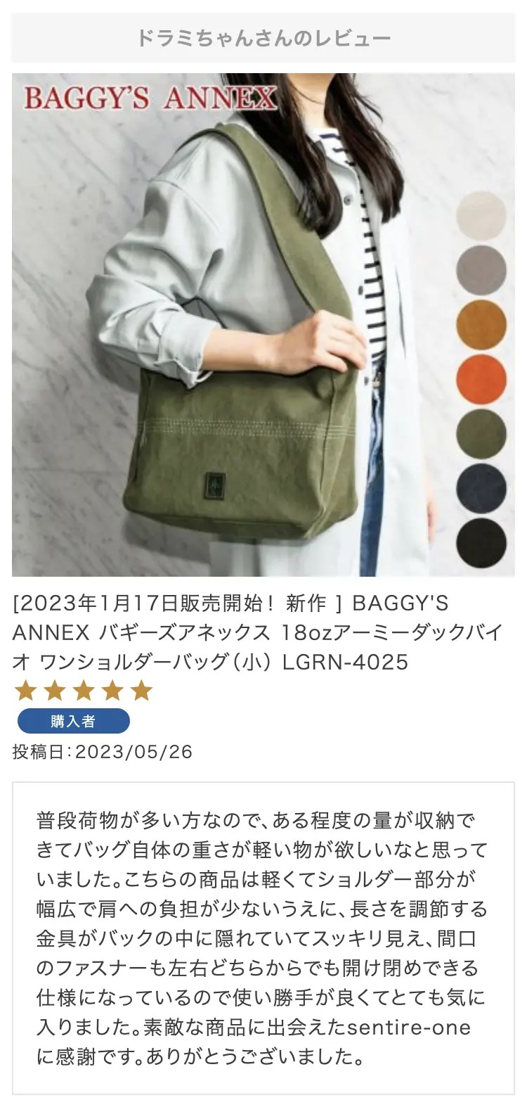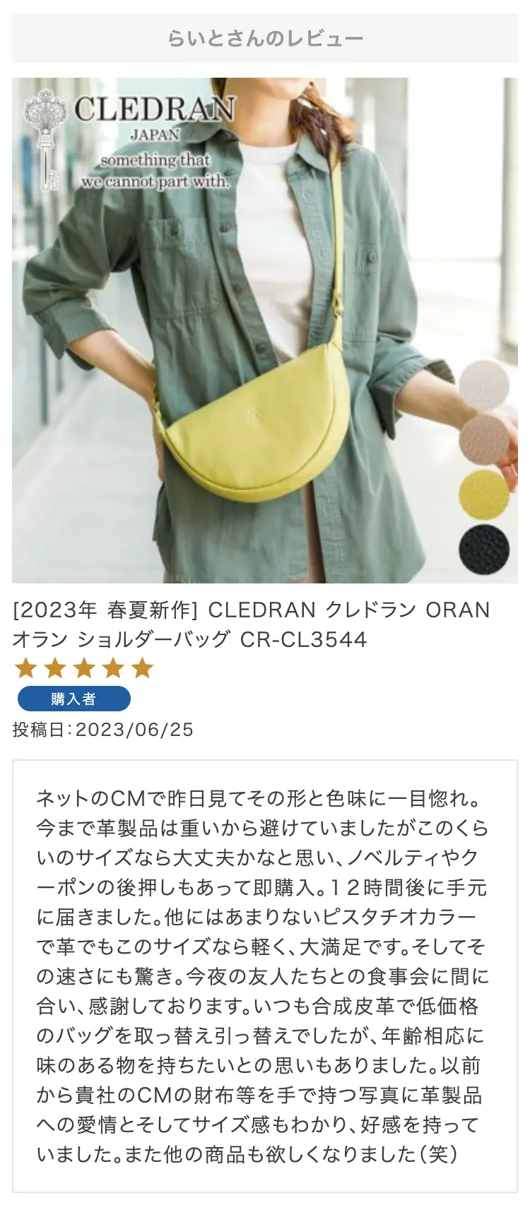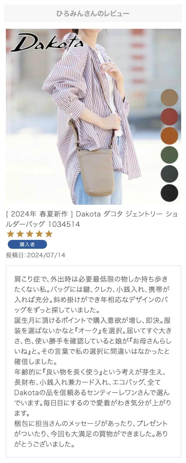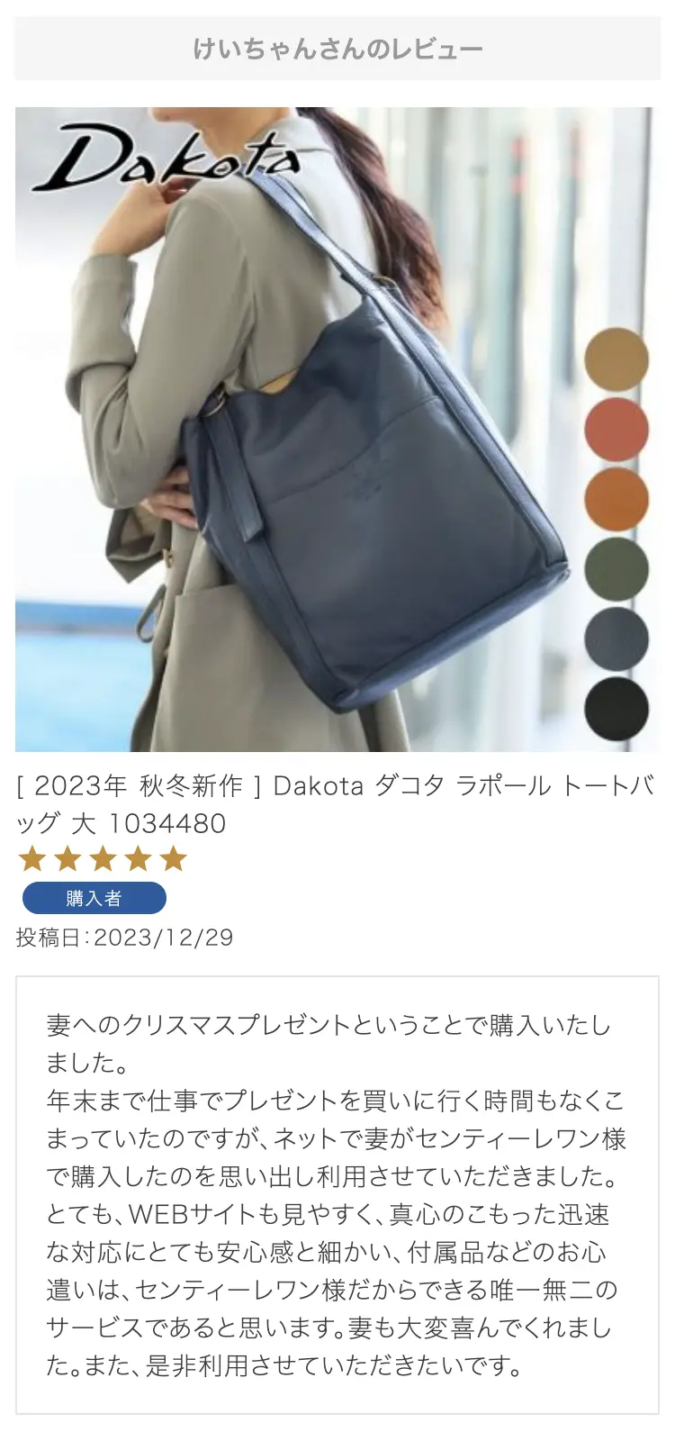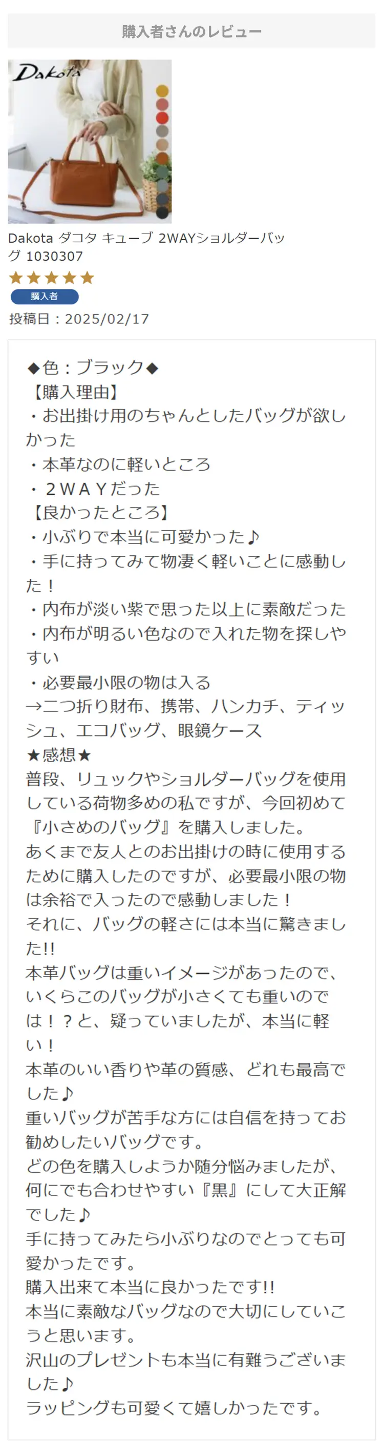 ・【※レビュー大感謝キャンペーンの対象外商品です】 という表記のある商品は、レビューキャンペーンの受付・特典ともに対象外となります。※レビュー自体のご投稿はいただけますが、レビューキャンペーンポイントの付与、および特賞受賞の対象外となります。事前にご確認をお願い致します。 ・当店カートシステムにおきましては、レビューご記入後は一旦必ず「有効待ち」のレビューポイントがお客様に付与され、当店で「有効」処理を実施することで初めてお客様がご利用いただける仕様となっております。レビューキャンペーンの対象商品の場合は「有効」処理を、対象外商品の場合は「無効」処理をそれぞれ行わせていただきます。 ・レビューキャンペーンポイント、誕生日ポイント、アンケート回答ポイント等のポイントを使用して、0円決済や請求金額1,000円以下の少額決済を行われた場合(または繰り返された場合)、過去複数回のご注文におけるご請求金額の合計が一定金額に満たない場合、「(1)該当するご注文のキャンセル」「(2)付与済みのポイントを無効化」 「(3)次回以降のお取引をキャンセル」「(4)今後一切のご注文の受付不可」のいずれか、もしくは全てのご対応をさせていただく場合がございます。その他当店にて悪質であると判断した場合も、同様のご対応をさせていただく場合がございます。 ・レビューご投稿は、事前に会員登録を済ませた上で商品をご購入いただく必要がございます。会員登録がない状態ですとシステム上、ご注文情報とレビューご投稿の紐付けが行えないため、必ず事前に会員ご登録をいただきますよう、お願い致します。 ・商品1点につき1回までのレビューご投稿が可能です。 ・同一商品に複数回レビューご投稿いただいた場合、古いご投稿内容が上書き更新されます(ご投稿日付は古いご投稿日付のままとなります)。誠に恐れ入りますがレビューキャンペーンへのご投稿は、1回目のご投稿・ご投稿月のみの受付とさせていただきます。あらかじめご了承ください。 ・複数商品注文時など、必ずそれぞれの商品の方へ個別にレビュー記入をお願い致します。例えば、DakotaのバッグとDakotaラッピングサービスを同時に注文され、該当バッグのレビューをDakotaラッピングサービスの方へご記入いただいた場合、本キャンペーンの対象外となります。 ・ページ変更や期間限定商品など、一定期間が経過した後、レビューをご記入いただけなくなる商品などもございます。予めご了承ください。 ・他人の権利、利益、名誉などを損ねたり、法令に違反する内容を投稿することはできませんのでご注意ください。レビュー内容が不適切と判断した場合は、レビューの承認不可または、予告なくレビュー投稿を削除させていただく場合がございます。その際、レビューの公開とポイント付与は致しかねますので、何卒ご了承ください。 ・ご投稿いただいたレビューは、当店の商品ページ以外にも、当店の他ぺージ・ブログ等でご紹介させていただく場合がございます。 ・レビューご投稿をいただいた時点で、上記全てをご了承されたものと致します。 |