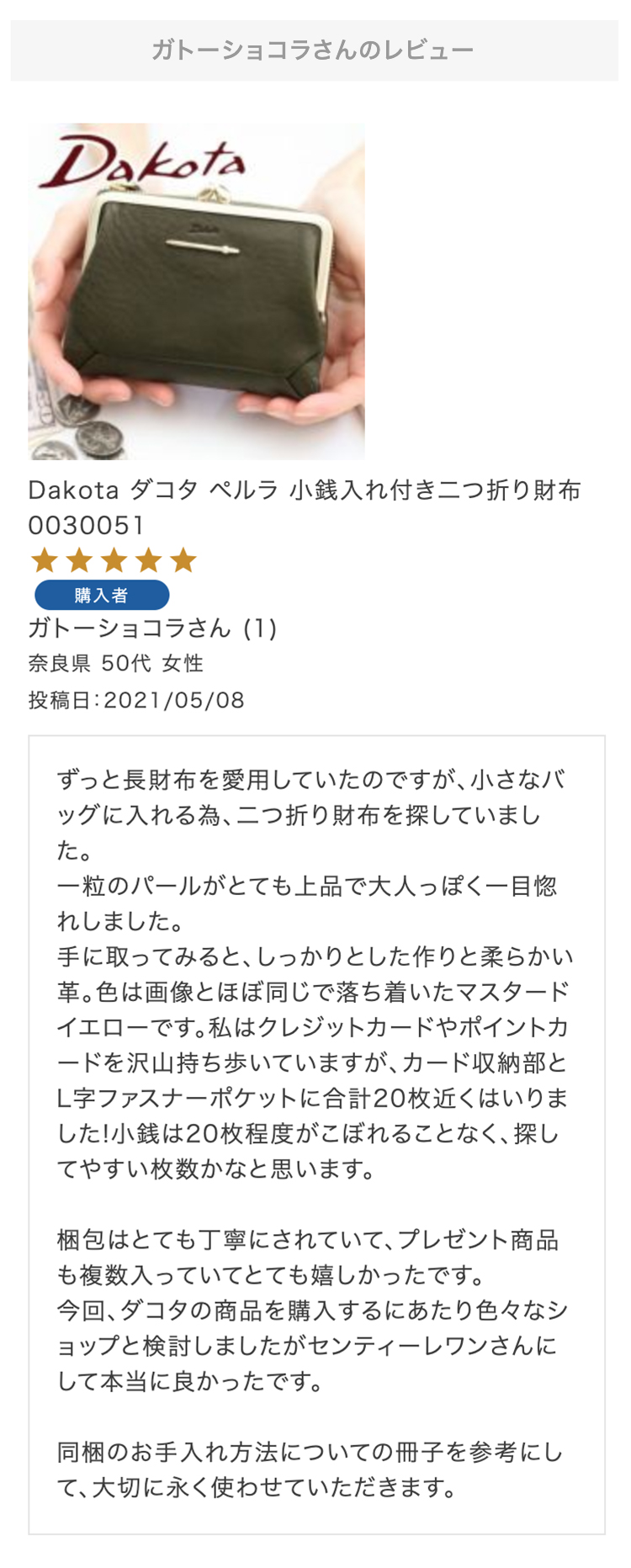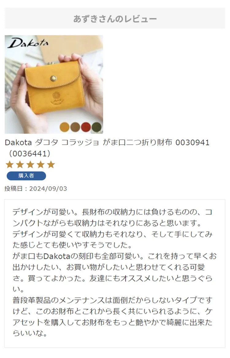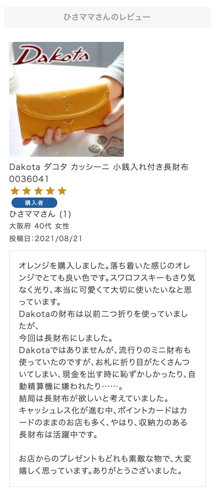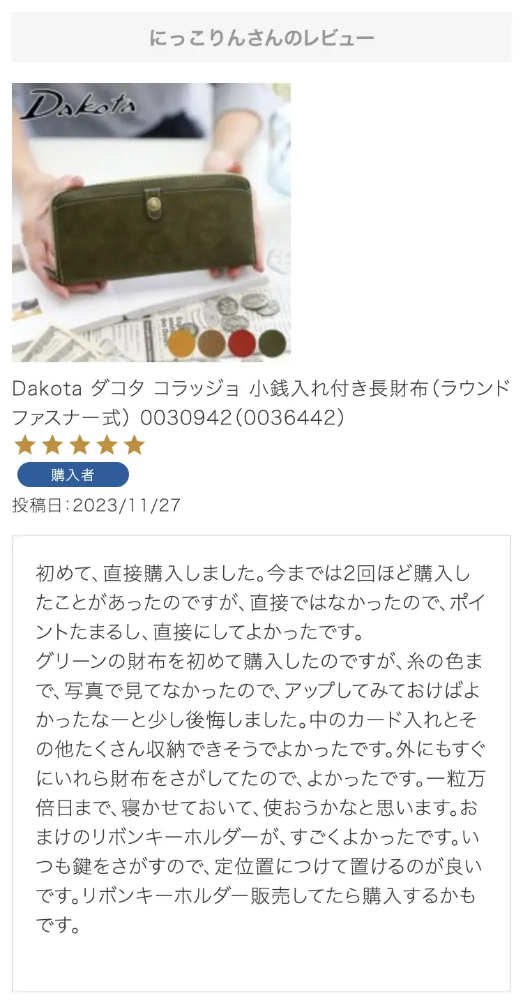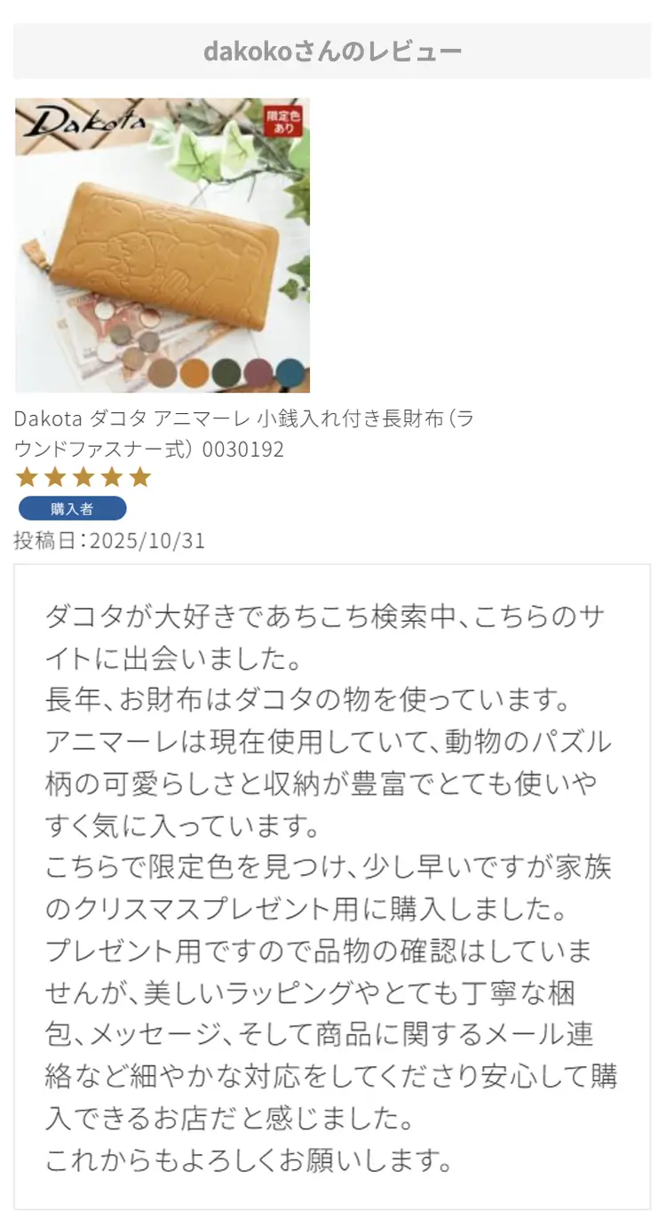 お母さんの誕生日プレゼントにこちらの財布を選びました!母はダコタさんのお財布を学生の時から好きで、育児でお世話になったので奮発して買いました!ラッピングもとても綺麗で特典まであり、大満足です。母にあげるのがとても楽しみです。