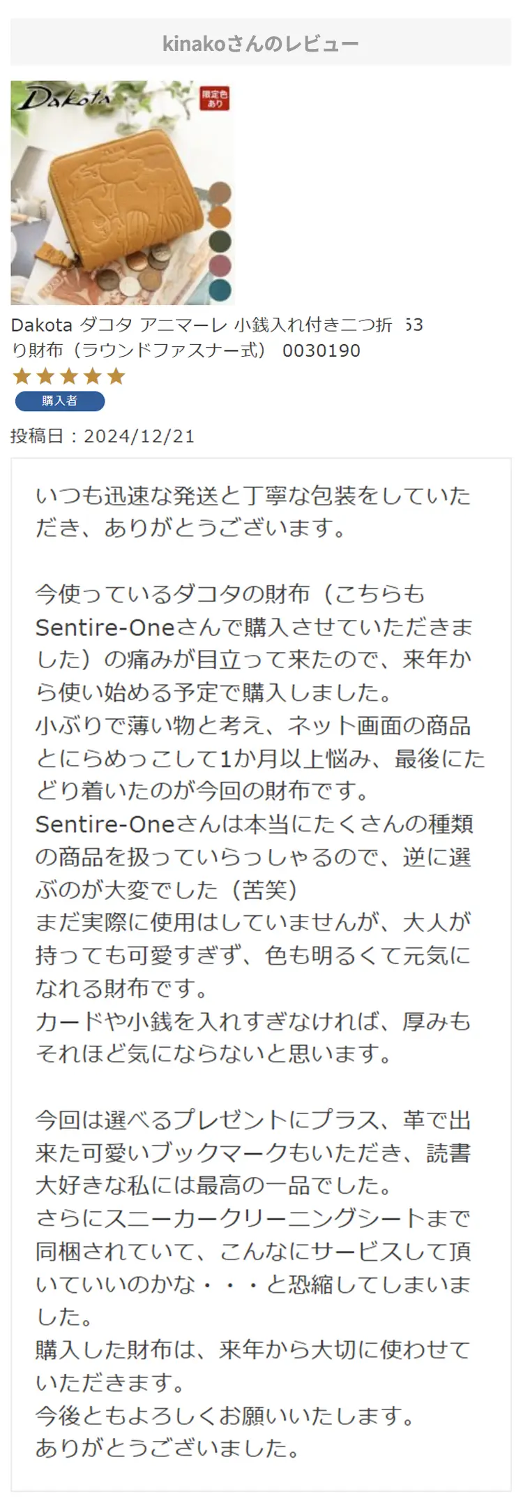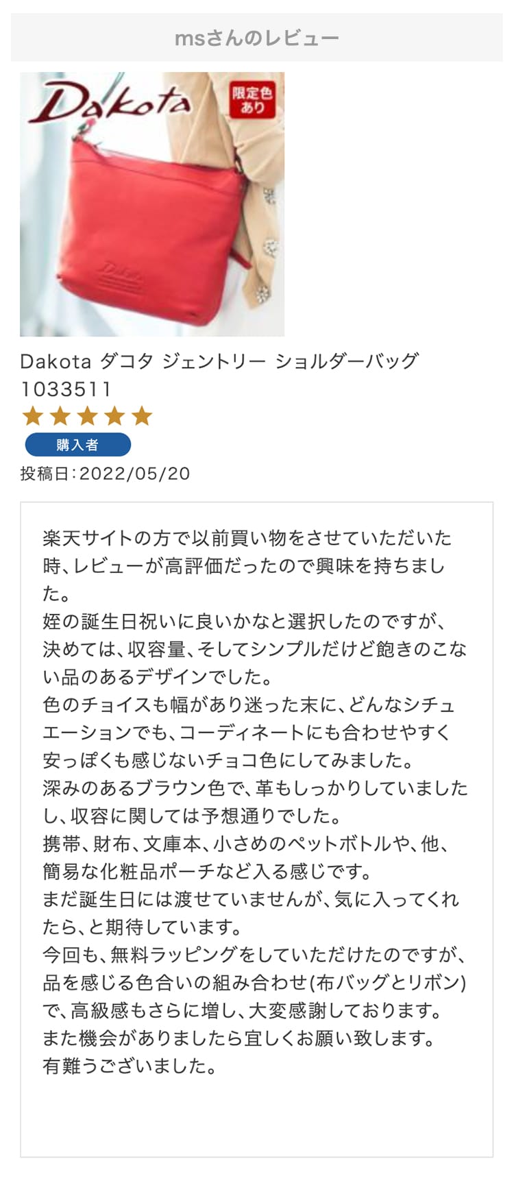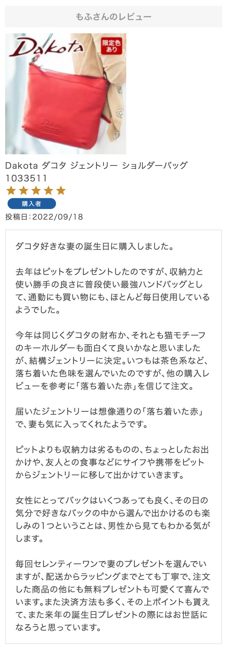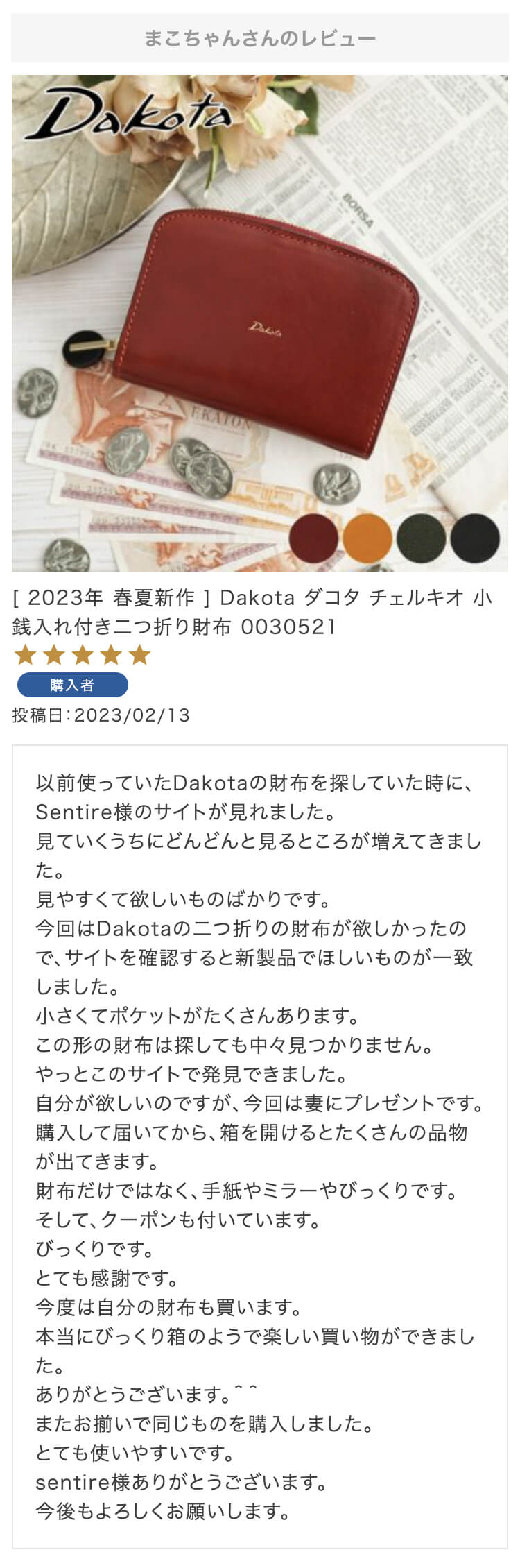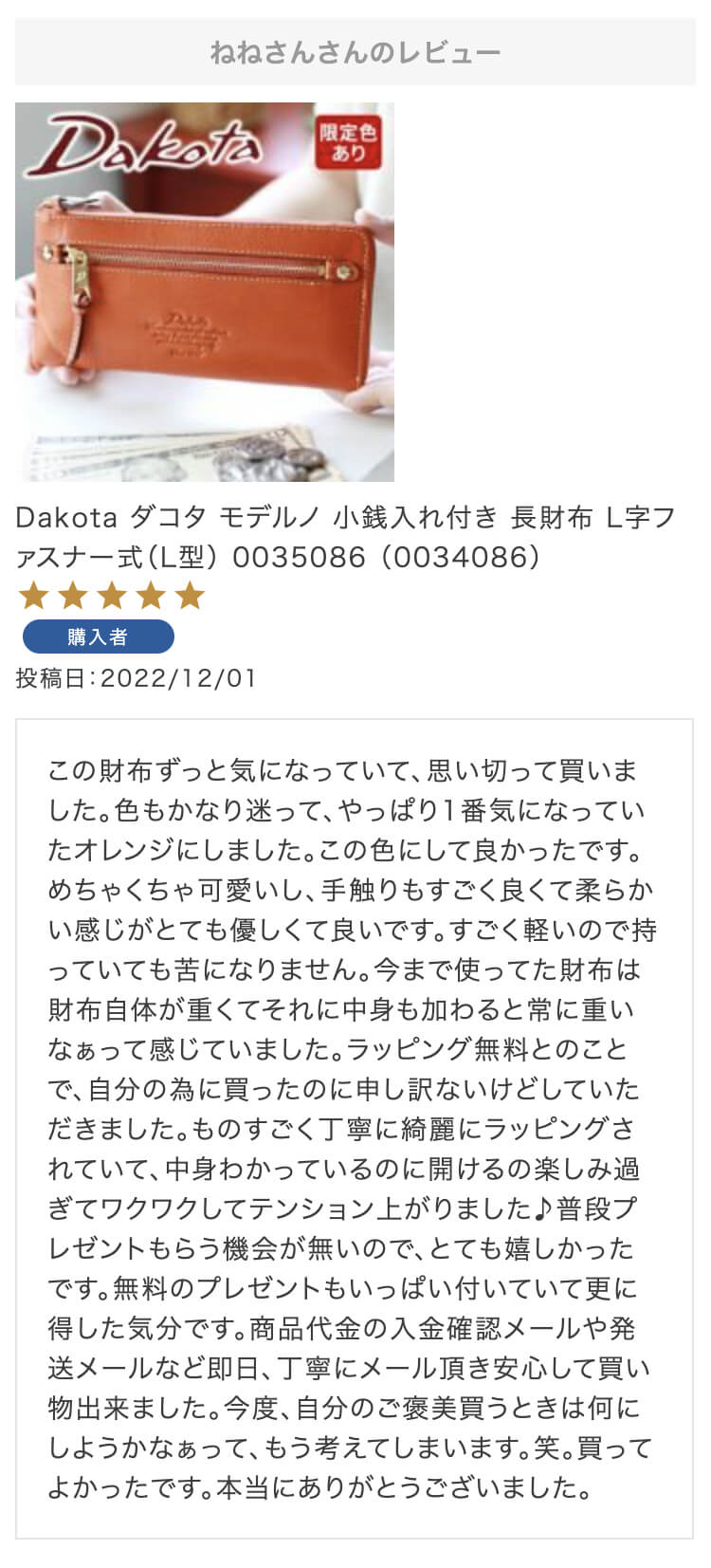 お母さんの誕生日プレゼントにこちらの財布を選びました!母はダコタさんのお財布を学生の時から好きで、育児でお世話になったので奮発して買いました!ラッピングもとても綺麗で特典まであり、大満足です。母にあげるのがとても楽しみです。
