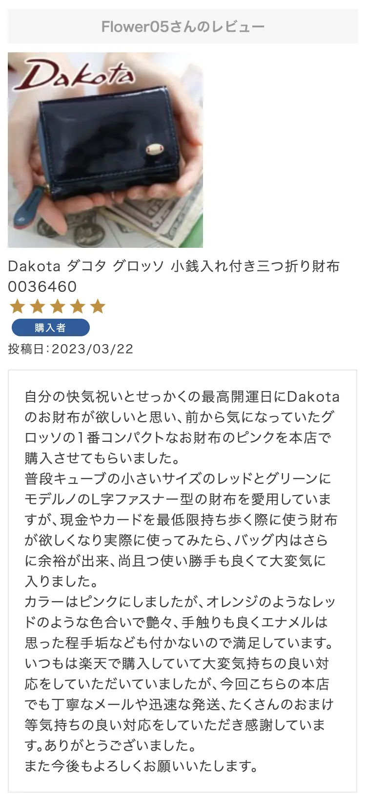 第26回 レビュー大感謝キャンペーン 特賞お名前:Flower05様投稿日:2023/3/22