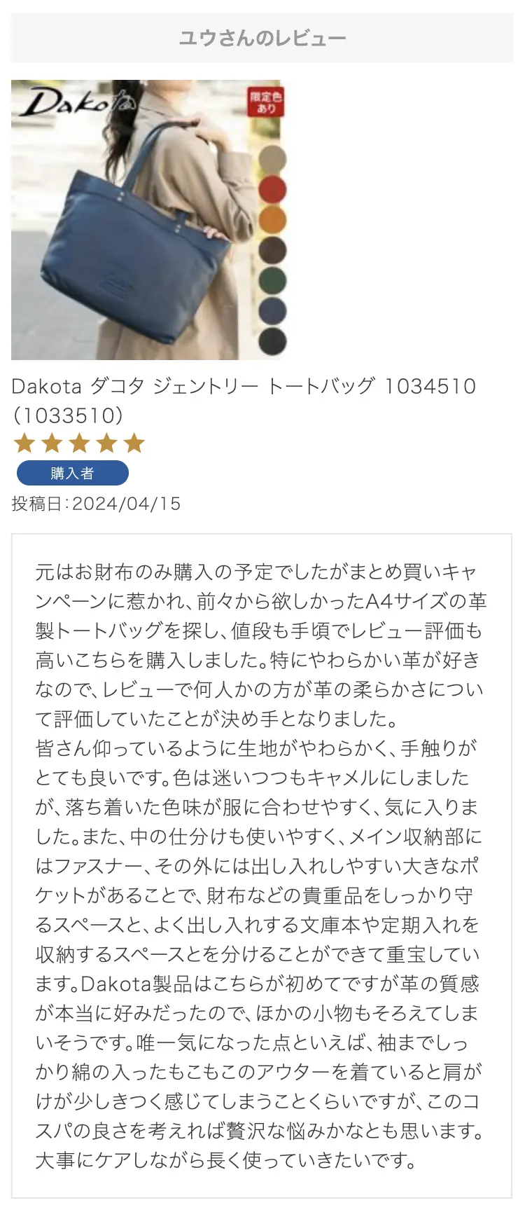 今まではリュックが多かったのですが。。 初めてDakotaのトートバックを購入しました。 色も赤で元気が出ると思い。 。今まで使った事のない色にしましたが。 凄く品がある赤の色はとってもお洒落だと思いました。 このトートバックは両サイドが物を収納しやすく取り出しやすい。 という点がかなり自分の中ではポイントが高かったです。 打ち合わせで頂く資料も入る大きさで。 真ん中のファスナーは大事なお財布もしっかり安心です。 自分の為のご褒美にはこの赤いトートバックを選んでよかったです。 心までウキウキ明るい気持ちにさせてくれるバックです。 買って良かったです。